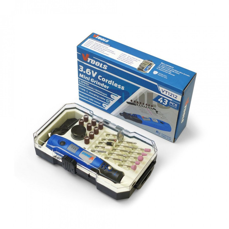 از فرز مینیاتوری جهت کارهای ظریف فرزکاری و با دقت بالا از قبیل مجسمه سازی، تراشکاری و قالب گیری، ساخت کاردستی، ساخت و تولید لوازم دندانپزشکی و.. مورد استفاده قرار میگیرد. این ابزار کاربردی در بازار دارای انواع مختلف همچون دیجیتال و آنالوگ یا بالوازم و بدون لوازم می باشد.فرز انگشتی مینیاتوری شارژی وی تولزمدل VT1212یکی از این نوع فرزها میباشد که دارای ابزارهای متنوعی جهت برش ، سایش ، پرداخت ، ساب انواع سطوح میباشد. فرز مینیاتوری شارژی وی تولز دستگاهی عالی برای کارهای ظریف است و از آن میتوان در موارد بسیاری مانند کاشت ناخن، ساخت زیورآلات، صنایع دستی و غیره استفاده کرد. این فرز مینیاتوری 3.6 ولت دارای سه سرعت 5، 12 و 18 هزار دور در دقیقه است که به شما انتخاب سرعت چرخش مناسب را میدهد. استفاده از این دستگاه بسیار راحت است و با فشار یک دکمه میتوانید آن را روشن و خاموش کنید و سرعتش را تغییر دهید. طراحی ارگونومیک و سبک بدنه باعث میشود مانند یک قلم، راحت بتوانید از آن استفاده کنید. موتور با کیفیت مسی این دستگاه سبب افزایش قدرت، چرخش نرم و عمر طولانی آن شده است. لوازم جانبی این دستگاه شامل 40 سری متنوع میشود که امکان ساخت هرنوع صنایع دستی و یا پروژه خانگی را برایتان فراهم میآورد. طراحی زیبا و کاربردی این دستگاه به گونهای است که هر سری جای مخصوص خود را دارد، در نتیجه میتوانید به راحتی آنها را پیدا کنید، آنها را منظم بچینید و بدون دردسر حمل کنید. با این بستهبندی دیگر لازم نیست نگران گم شدن سریهای دستگاه باشید. این پکیج جذاب برای ساخت صنایع دستی و کارهای هنری عالی است و تا سالها میتواند دستیار شما هنرمندان عزیز باشد.