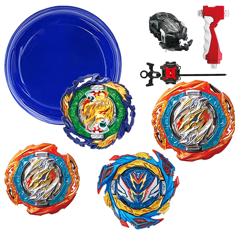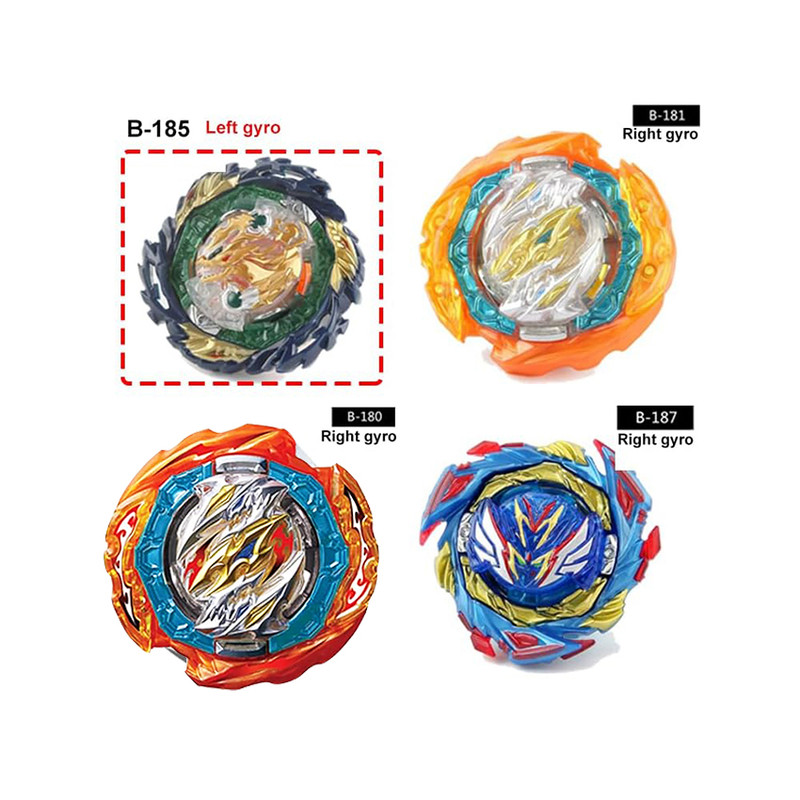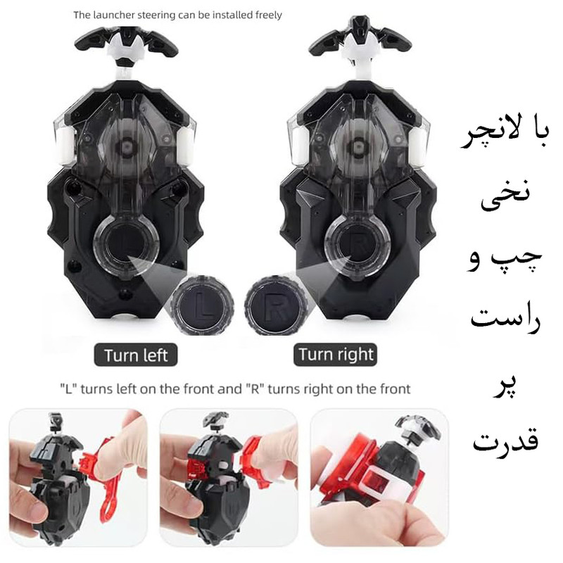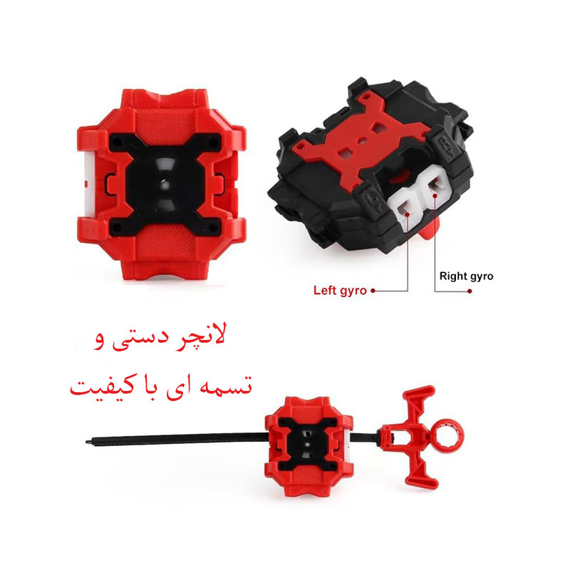 | اقلام همراه | بسته شامل: 4x فرفره چرخان. 2x لانچر نخی چپ و راست دسته لانچر تسمه ای به همراه تسمه؛ به همراه زمین بازی و برچسب ها - |