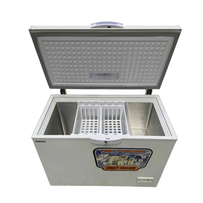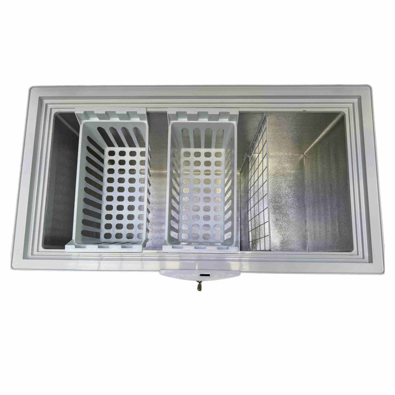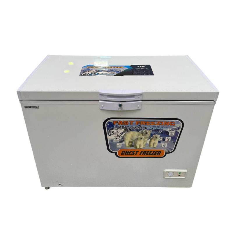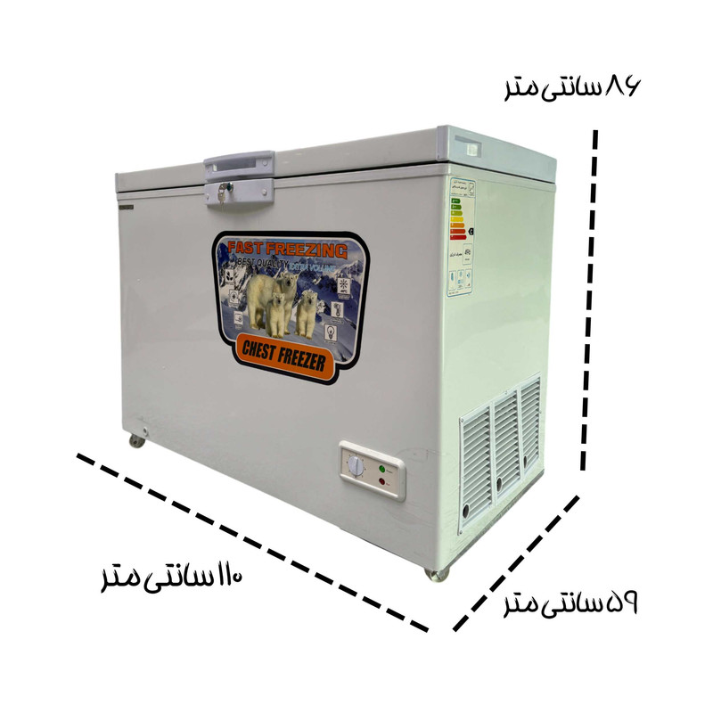 فریزر صندوقی افقی تک درب الکتروفام مدل EM-270 یک محصول جذاب و کار آمد مناسب برای استفاده در فروشگاه ها، مکان های تجاری و حتی خانه است. طول، عرض و ارتفاع این محصول به ترتیب 110، 59 و 86 سانتی متر است. این محصول به دو قسمت با دو سبد تقسیم شده که قسمت بزرگ به عمق 63 سانتی متر و قسمت کوچک تر به عمق 36 سانتی متر است. تنظیم دما فریزر در پایین این محصول قرار گرفته است که ولوم از عدد 0 تا 7 نمایش می دهد و می توانید دمای مورد نیاز را تنظیم کنید. این فریزر کمترین برودتی که ارائه می کند تا منفی 18 درجه سانتی گراد است. دو نشانگر قرمز و سبز کنار ولوم تنظیم دما به این معنی است که اگر نشانگر قرمز بود یعنی برق محصول وصل است و اگر نشانگر سبز بود یعنی کمپرسور در حال کار کردن است.از دیگر مزایای این فریزر صندوقی می توان به روشنایی، گرید انرژی C، شیشه روی یخچال و مصرف انرژی بهینه اشاره کرد. شیر تخلیه هم در قسمت پایین این فریزر است. رنگ این محصول سفید است.