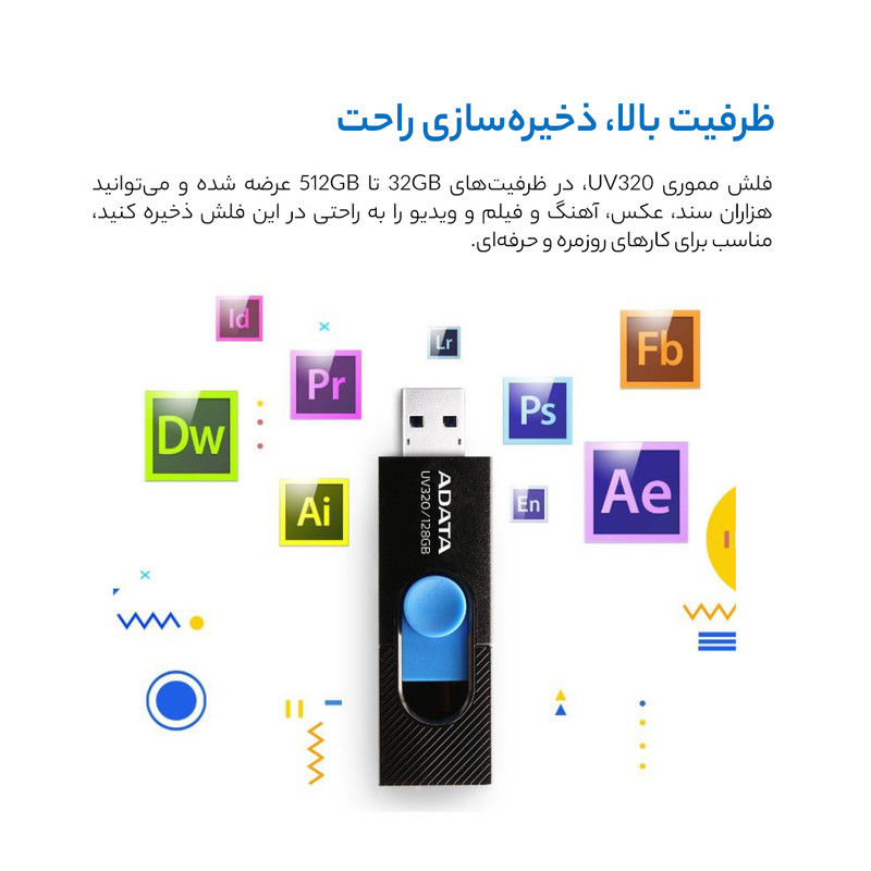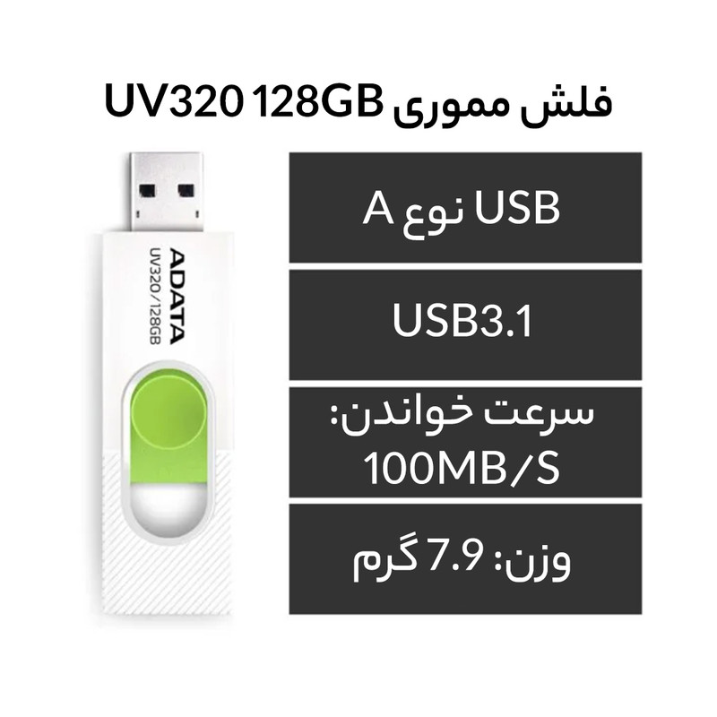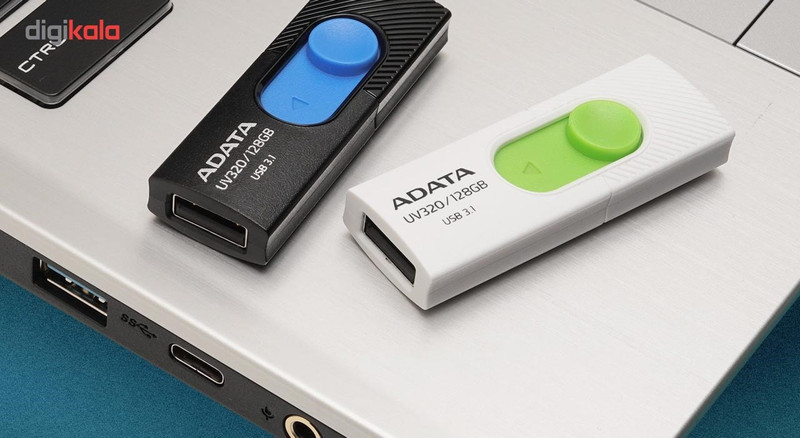 مدل «UV320» از سری محصولات فلش میموری شرکت «ای دیتا» (ADATA) است که در ظرفیتهای 8 تا 64 گیگابایتی و در رنگهای مختلف عرضه میشود. این فلش میموری از حافظه 128 گیگابایتی بهرهمند است؛ با این مقدار ظرفیت، حجم بسیار زیادی از اطلاعات؛ از قبیل موسیقی، فیلم و ... را میتوانید همیشه در کنار خود داشته باشید . در راستای طراحی جمعوجور، شرکت ای دیتا بر روی UV320 یک کلید تعبیه کرده است که با فشار دادن آن به جلو، درگاه USB به بیرون هدایت میشود و برای برگرداندن آن به داخل، بایستی کلید را به عقب بکشید. درگاه USB این حافظه فلش USB 3.1 است و از سرعت استاندارد انتقال اطلاعات 10 گیگابیت بر ثانیه برخوردار است. این فلش میموری با بیشتر دستگاههای الکترونیکی اعم از لپ تاپ، کامپیوتر، تلفن هوشمند، تلویزیون هوشمند، سیستم صوتی خودرو و ... سازگاری دارد. حافظه فلش UV320 در برابر آب، گردوغبار و ضربه مقاوم نیست؛ بنابراین هنگام استفاده، مواظب صدمات احتمالی باشید