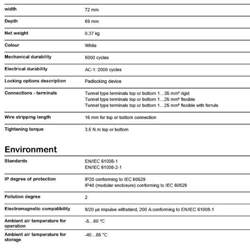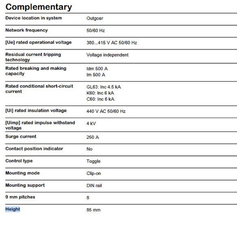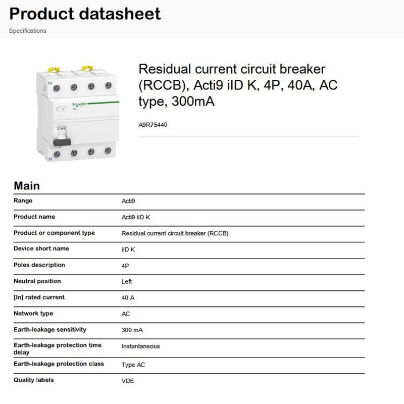 | سایر توضیحات | رنگ: سفید رنج محصول: Acti 9 موقعیت ترمینال نول: چپ جریان نامی (In): 40 آمپر نوع شبکه برق: AC حساسیت نشتی: 300 میلیآمپر ولتاژ کاری نامی: 380 الی 415 ولت AC در فرکانس 50/60 هرتز ظرفیت نامی قطع و وصل: 500 آمپر جریان اتصال کوتاه نامی: 6 کیلوآمپر ولتاژ عایق نامی (ui): 440 ولت AC آستانه شکست ولتاژ موجی: 4 کیلو ولت استاندارد ها: EN/IEC 61008-1 استاندارد IP: IP20 دمای محیط هنگام کارکرد: 5- الی 60 درجه سانتیگراد |