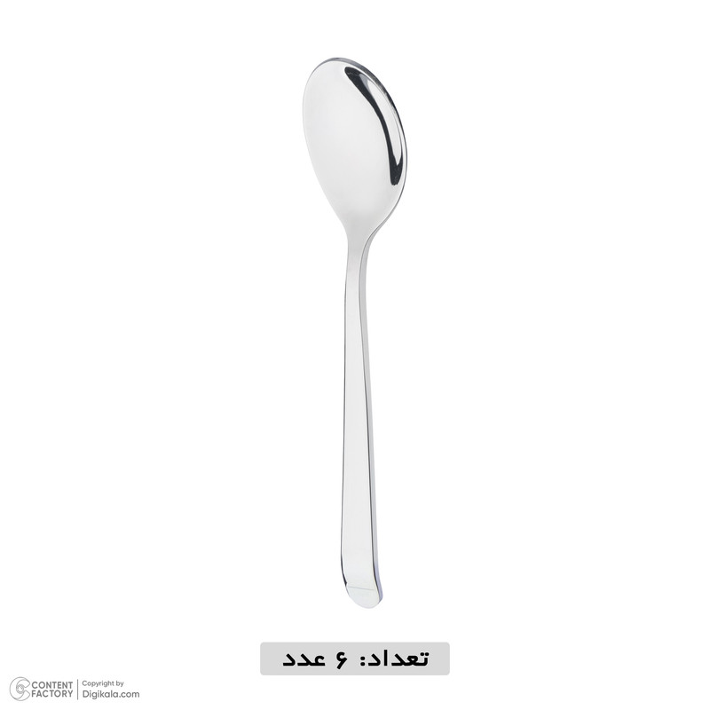 | سایر توضیحات | 6 عدد قاشق چای خوری به ابعاد 11x2.5x0.3 سانتی متر و وزن 15 گرم - استیل18/10ضد زنگ با ضخامت 3 میلیمتر |