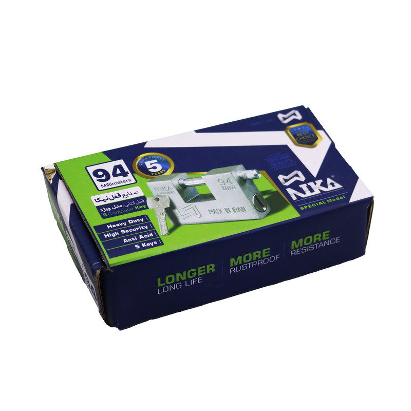| سایر توضیحات | - قفل کتابی نیکا مدل ویژه - برند: نیکا - مدل: ویژه - نوع: کتابی - سایز: 94 میلی متر - ابعاد: 100×70×30 میلی متر - وزن: 1005 گرم - جنس: فولاد - روکش: آبکاری کروم - کلید: 5 کلید کامپیوتری - رنگ: نقره ای - کیفیت بالا - دارای سیلندر تمام برنجی |