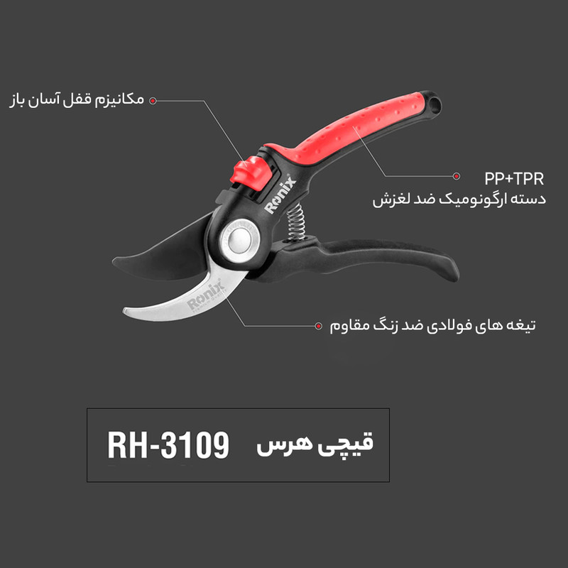 بسیار خوش دست • نسبتا مقاوم • مناسب برای هرسهای سبک • مجهز به سیستم قفل کن با دوام به منظور کاربری آسان تر • طراحی با رعایت اصول ارگونومی، بدون خستگی دست در کاربری های طولانی مدت دسته پلاستیکی مواد درجه یک می باشد