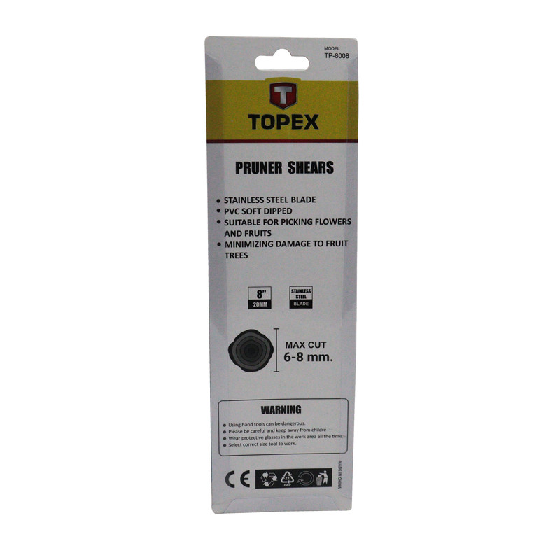 قیچی میوه چین 8 اینچی تاپکس مدل ، ابزاری بسیار مناسب و کارامد برای چیدن میوه‌ها محسوب می‌شود. استفاده از این قیچی باعث می‌شود عمل چیدن میوه‌ها با سرعت بیشتری انجام گیرد و آسیب کمتری به گیاهان وارد شود. سر صاف و بلند این محصول با طراحی مناسبی که دارد به خوبی میوه را از گیاه جدا می‌کند. تیغه‌ی این ابزار از جنس فولاد S50C است و طول عمر بالایی دارد. برای کاهش وزن این محصول دسته‌ای از جنس آلومینیوم برای آن در نظر گرفته است.