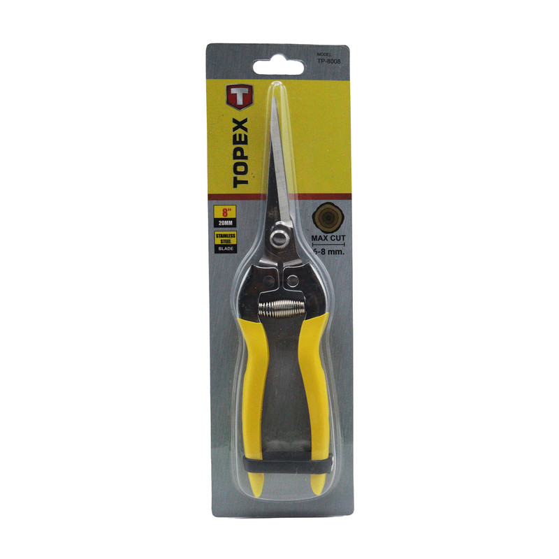 سایر توضیحات- قیچی میوه چین تاپکس - مدل کوتاه سر صاف تاپکس - سایز 8 اینچ - دارای سری صاف و بلند برای چیدن انواع میوه - دسته‌ی آلومینیومی با روکش PVC - کیفیت بالا