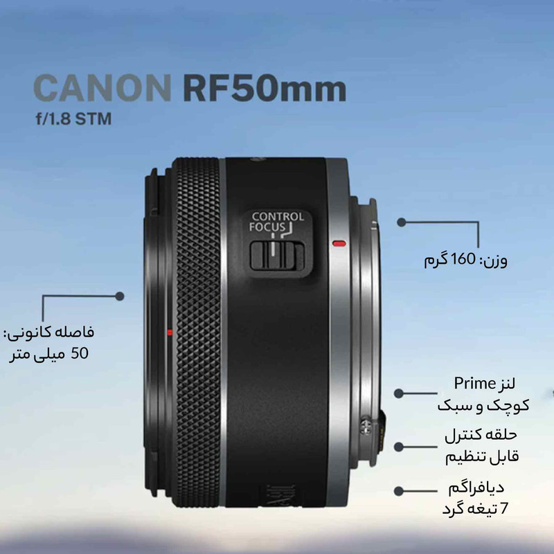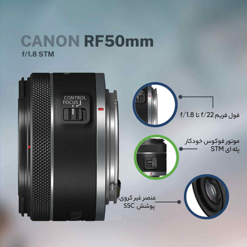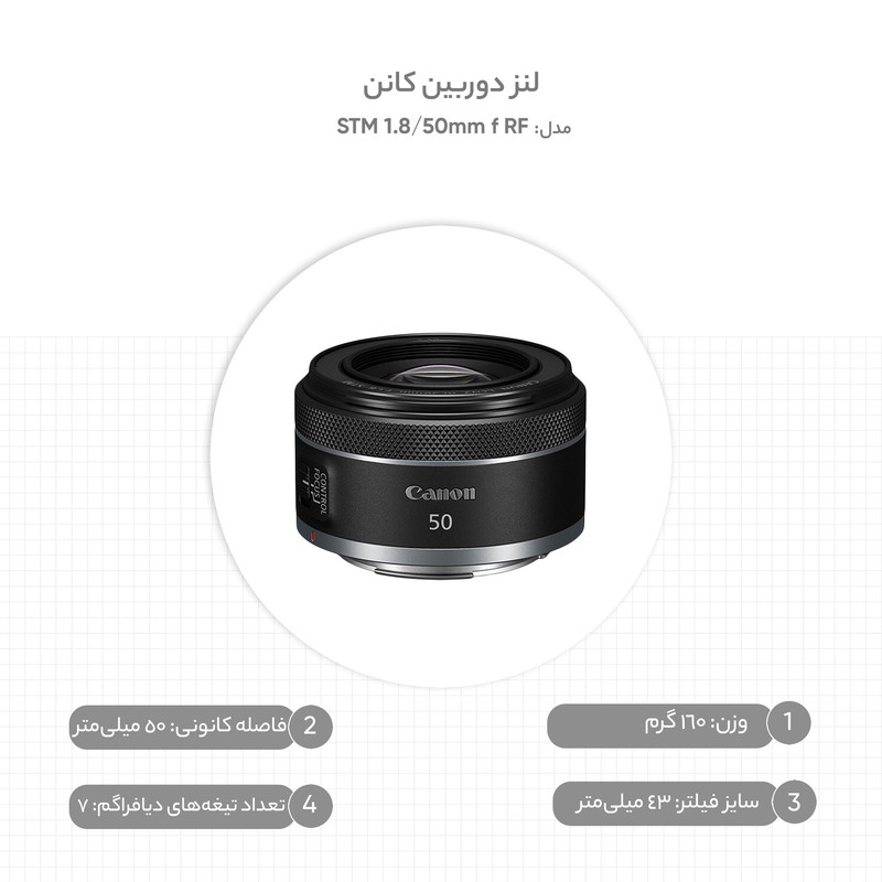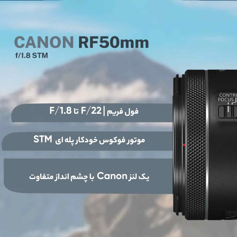 لنز کانن RF 50mm f/1.8 STM، یک محصول سبک‌وزن با پرکاربردترین فاصله کانونی، یعنی 50 میلی‌متر است. می‌توان گفت که لنزهای 50 میلی‌متری، پراستفاده‌ترین لنزها در عکاسی هستند و هر عکاسی نیاز دارد تا چنین لنزی را در مجموعه خود داشته باشد. این محصول را می‌توان لنزی همه‌کاره دانست که از طراحی جمع‌وجوری برخوردار است و به همین دلیل جابه‌جایی آن به‌راحتی انجام می‌گیرد. حداکثر گشودگی دیافراگم این محصول f/1.8 است که آن را برای عکاسی در شرایط نوری نامناسب نیز مناسب ساخته و عمق میدان کمی را در اختیار شما قرار می‌دهد؛ این بدان معناست که می‌توانید با کیفیت بهتری سوژه را از بک‌گراند جدا کرده و بوکه‌های دل‌چسبی را در اختیار داشته باشید. در ساختار اپتیکی این محصول از یک المان آسفریکال استفاده شده است که باعث شده دیستورشن و خطاهای اپتیکی در این لنز کاهش پیدا کنند. هم‌چنین کانن از کوتینگ Super Spectra هم در این لنز استفاده کرده که موجب شده پدیده شبح وارگی و فلر کاهش پیدا کرده و تصاویر ثبت شده با این لنز کنتراست و دقت رنگی بالایی داشته باشند. سیستم فوکوس خودکار کانن 50mm f/1.8 RF از نوع STM است که عملکردی روان و ساکت دارد. همچنین این سیستم، امکان فوکوس دستی را نیز در اختیار کاربر قرار خواهد داد. هم‌چنین روی بدنه لنز یک رینگ کنترل قرار دارد که می‌توانید با استفاده از آن، تنظیمات مربوط به نوردهی مانند ISO، دیافراگم و جبران نوردهی را تغییر دهید.