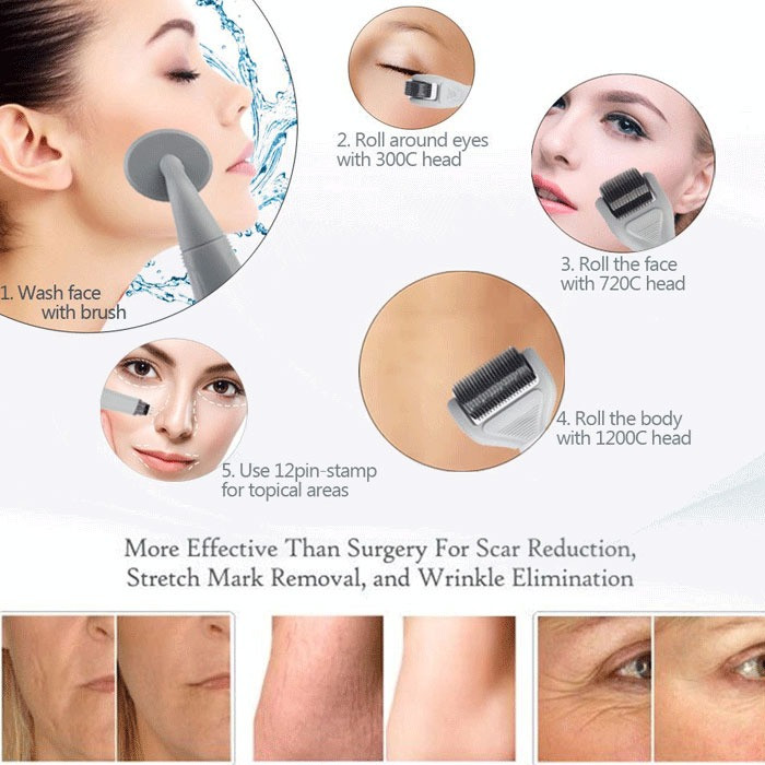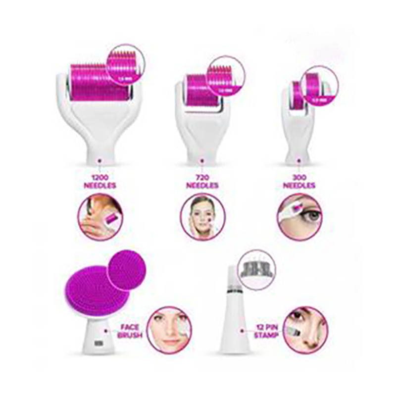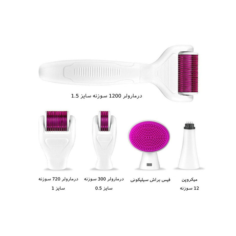 درمارولر 6در 1 با سوزنهایی از جنس تیتانیوم بهترین راه حل برای افزایش کلاژنسازی، جوانسازی و جلوگیری از پیری، شلی و چین و چروک پوست و سایر مشکلات پوستی مانند از بین برنده و جلوگیری از چین و چروک، درمان جای جوش و اسکار،کشیدگیها و خطوط پوستی،از بین برنده سلولیت، کیسه و تیرگی زیر چشم، لکههای تیره، جای بخیه و ... است.درمارولر 6 در 1 اسکیناوو شامل 4 سری در سایزهای مختلف،دسته سفید رنگ،ظرف مخصوص ضد عفونی .یک براش سشتشوی صورت و یک کیف مخصوص نگهداری بهداشتی است.کاربرد هر یک از سایزهای درمارولر (سریهای این پکیج):1- سایز 0.5 میلی متر 240 سوزنه: بیشترین کاربرد برای دور چشم، درمان ریزش مو،اسکار و خطوط کم عمق، درمان هایپر پیگمنتیشن یعنی لکه های تیره پوستی و شفافسازی پوست و... درمان را هر 6 الی 11 روز (بر حسب زمان لازم برای ترمیم) تکرار کنید.موارد منع استفاده از درمارولر:لطفا اگر دارای زخم یا بریدگی باز، آفتاب سوختگی، هرگونه عفونت حاد یا التهاب پوستی، بیماریهای کلاژن، مشکلات خونی یا سرطان هستید از درمارولر استفاده نکنید.از کشیدن درمارولر بر روی جوشهای فعال نیز پرهیز کنید چون ممکن است باعث پخش شدن آن شود.