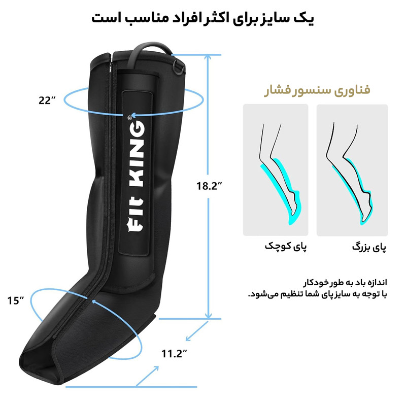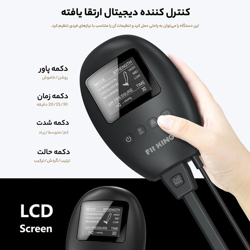 سایر توضیحاتچکمه های فشرده چیست؟ چکمه های فشرده آستین های بادی زیر زانو هستند که به کیسه خواب برای پاها تشبیه می شوند و با استفاده از فشرده سازی هوا، پاها را برای بهبود جریان و گردش خون فشار می دهند. مهم نیست که چه نوع تمرین یا تمرینی انجام می دهید، ماهیچه های شما ریز پارگی هایی را تجربه می کنند که منجر به درد عضلانی، ادم یا تورم می شود. اگر به طور مناسب بهبود پیدا کنید، به طور طبیعی از بین می رود، اما زمان زیادی طول می کشد و بیشتر اوقات نمی توانید آنقدر صبر کنید. در اینجا چکمه های بازیابی فشرده سازی ارائه می شود، فشرده سازی پویا پنوماتیک را فراهم می کند، انقباض عضلانی را تحریک می کند و جریان خون را افزایش می دهد، اسید لاکتیک را حذف می کند و عضلات شما را سریع تر بهبود می بخشد. چکمه های فشرده چگونه به بازیابی کمک می کنند؟ میزان فشار بستگی به ماده مورد استفاده، میزان محکم اعمال آن و حرکت روزانه شما دارد. چکمه های فشرده سازی FIT KING با مزایای ثابت شده در تسکین درد، تسریع بهبودی به خوبی مورد بررسی قرار گرفته اند. زمان ایده آل برای استفاده از هوا درمانی هر زمان بعد از تمرین یا تمرین، یک روز سخت در محل کار یا بعد از مسافرت است. می توانید 15 تا 20 دقیقه قبل از تمرین از چکمه های فشرده سازی استفاده کنید، به محل کار بروید که بیشتر روزها را روی پای خود می گذرانید و گردش خون شما را افزایش می دهد و به عملکرد بهتر شما کمک می کند. فناوری سنسور فشار ارتقا یافته چکمه‌ها می‌توانند پاها تا 15.4 اینچ و ساق پا تا 22 اینچ مناسب باشند. سنسور فشار داخلی بدون توجه به اینکه پاهای شما بزرگ یا کوچک باشند، مناسب ترین فشار را برای شما فراهم می کند. مزایای چکمه های فشرده: فشار هوای موثر: کم 60/70/80 میلی متر جیوه. Mid-90/100/110 mmHg; High-120/130/140 mmHg 3 ناحیه ماساژ و 3 حالت مختلف ماساژ برای پوشش طیف وسیعی از نیازهای درمانی و آرامش بخش کنترلر هوشمند همه کاره کاربر پسند، داده های فشار هوا را به شما نشان می دهد سنسور فشار داخلی می تواند فشار یکسانی را به اندازه های مختلف پاها ارائه دهد پاهای شما را آرام می کند و پرانرژی باشید عملکرد ورزشی را افزایش می دهد و انعطاف پذیری عضلانی را افزایش می دهد ابزارهای توانبخشی بدون دست برای بازیابی از فشارهای عضلانی تورم لنفاوی را کاهش می دهد و از واریس و گرفتگی عضلات پا جلوگیری می کند. جریان برگشت ورید و لنف را تسریع می کند، گردش خون را تقویت می کند و متابولیسم را افزایش می دهد ماساژ هندزفری برای لذت بردن از ماساژ در حالت خوابیده یا نشسته عملکرد فوق العاده بی صدا با اختلال صفر تکنولوژی پوشیدنی زیپ با سبک شیک و مد روز