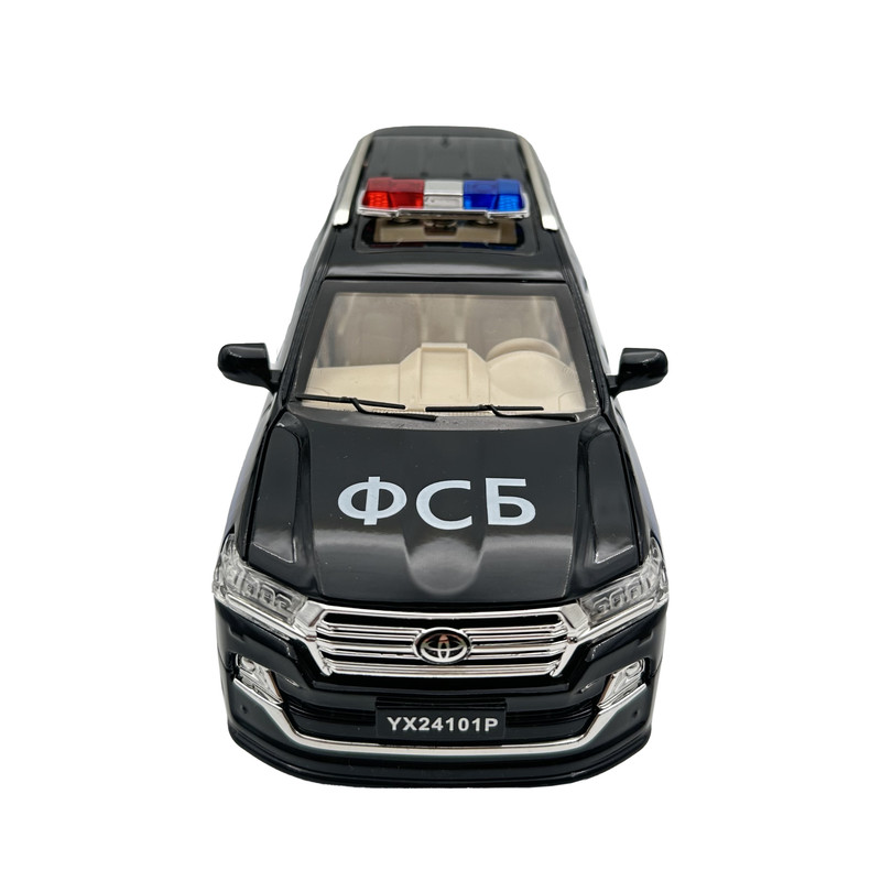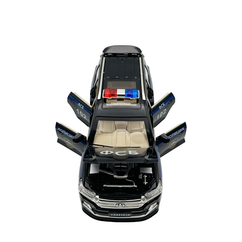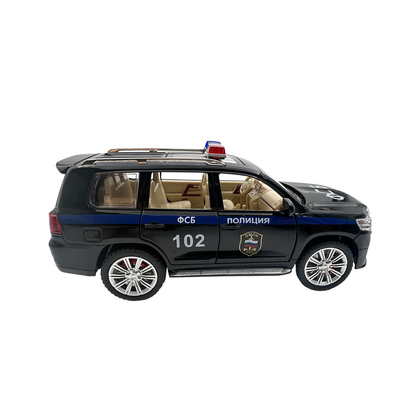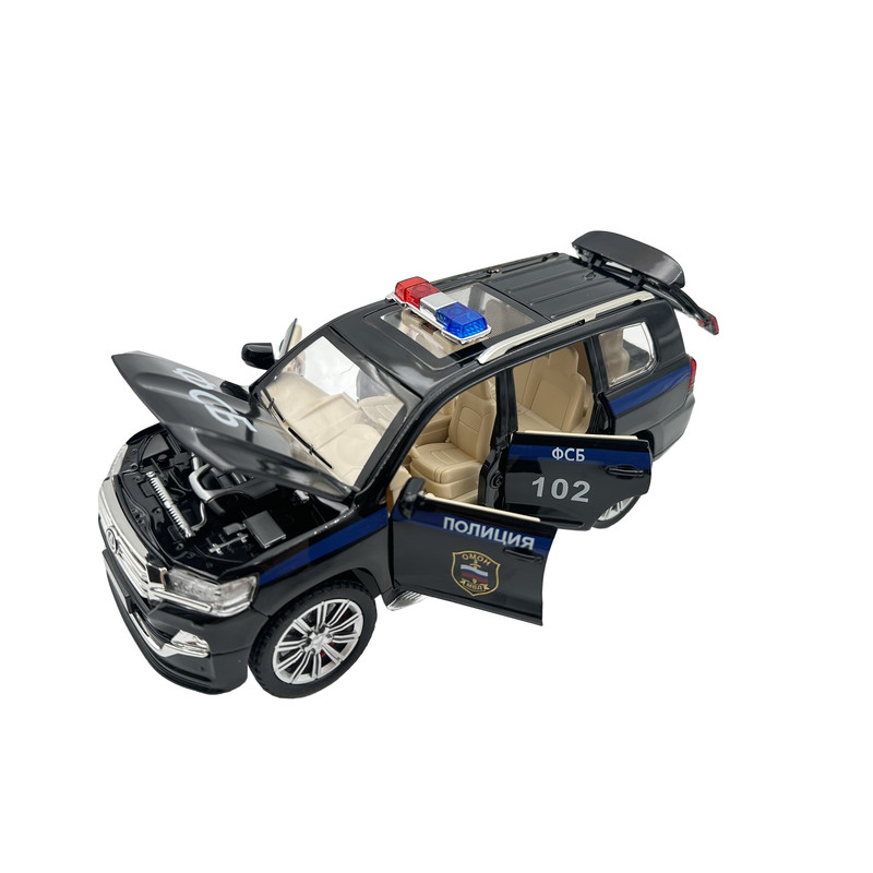 اسباب بازی ماشین لندکروز V8 مدل پلیس روس یک ماشین بازی از جنس فلز بوده که طول آن حدود 21 سانتی متر است. این ماشین فلزی که به صورت عقب کش می باشد قابلیت گردش چرخ های جلو به راست و چپ را داشته و همچنین دارای دکمه 3 حالته (خاموش - فقط چراغ روشن - چراغ و صدای آژیر روشن) می باشد. همچنین این ماشین فلزی دارای 6 درب باز شوند می باشد.