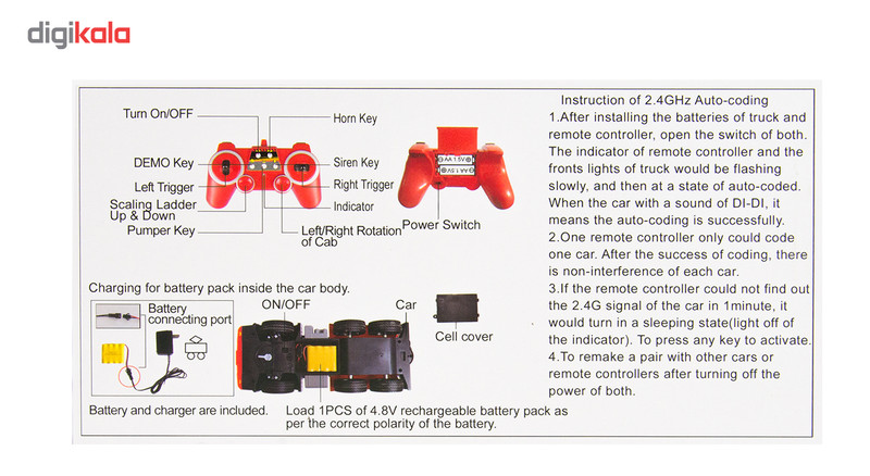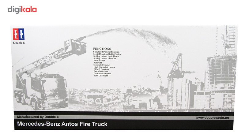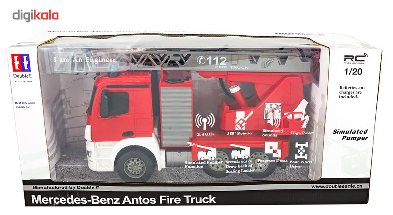 | سایر توضیحات | - قابلیت های آتش نشانی DOUBLE E: 360 Rotation (چرخش 360 درجه ) Simulated Pumper Function ( عملکرد شبیه سازی پمپ ) Stretch Out & Draw Back Of Scaling Ladder (قابلیت حرکت دادن بازو و ریل نردبان برای حمل پاشیدن آب ) Simulated Sound ( پخش صدای شبیه سازی شده) Program Demo Fun ( نمایش دمو برنامه ) High Power (قدرت بالا) Four Wheel Drive (چهار چرخ متحرک) - وجود نور و چراغ در قسمت های مختلف - کیفیت قطعات بسیار بالا - دارای کنترل از راه دور 2.4 گیگا هرتز - کاربردی و آموزشی برای کودکان و نوجوانان |