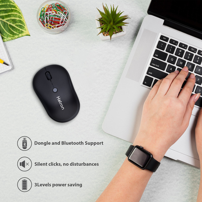 موس بی سیم هترون مدل HMBW115SL از سری موس های جدید هترون است که بی صدا و بسیار خوش‌ ساخت است. این مدل با توجه به طراحی شکل متقارن و قابلیت استفاده برای هر دو دست، بدون ایجاد خستگی برای دست، مناسب استفاده برای تمام روز است. ماوس HMBW115SL دارای کلید DPI Switch بوده و در سه سرعت 1200،800 و 1600 قابل‌تنظیم است. این ماوس هم از طریق بلوتوث و هم توسط دانگل مخصوص به کامپیوتر متصل می‌ شود و بدون نیاز به نصب درایور خاصی، پس از اتصال به کامپیوتر یا لپ‌تاپ قابل استفاده است. این مدل plug and play و بدون نیاز به نصب درایور بوده و به محض روشن شدن کامپیوتر روشن شده و آماده استفاده است و با خاموش شدن دستگاه، خاموش می شود و به این ترتیب در مصرف باتری صرفه جویی می شود. علاوه بر آن سوئیچ روشن/خاموش به شما این امکان را می دهد که در صورت عدم استفاده از ماوس برای مدت طولانی، آن را خاموش کنید. فرکانس این ماوس برابر 2٫4 گیگاهرتز است و تا 10 متر مسافت را پشتیبانی می‌ کند. به این ترتیب برای کنترل سیستم کامپیوتری خود، محدود به میز کار نبوده و به راحتی از فاصله دور هم قادر به انجام کارهای کامپیوتری خود هستید. موس بی سیم هترون با تمامی سیستم‌ عامل‌ های رایج سازگاری دارد. ماوس HMBW115SL از 4 کلید بهره می‌ برد و برای سیستم‌ های خانگی و اداری انتخاب مناسبی به‌ شمار می‌ آید. این ماوس با رنگ مشکی به بازار عرضه می‌شود و مناسب محیط های اداری نیز می باشد.