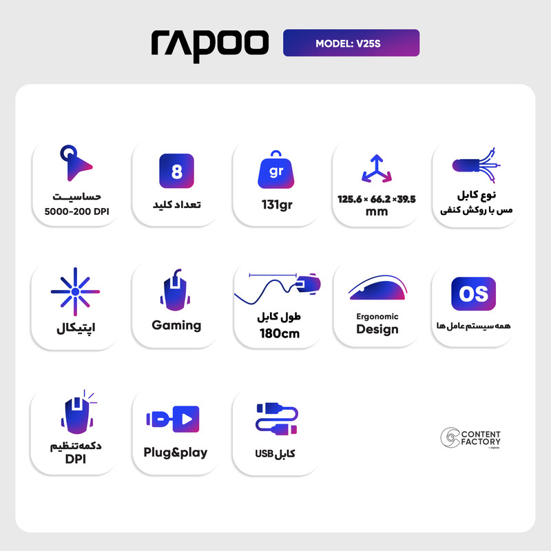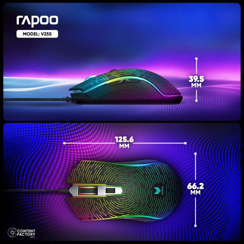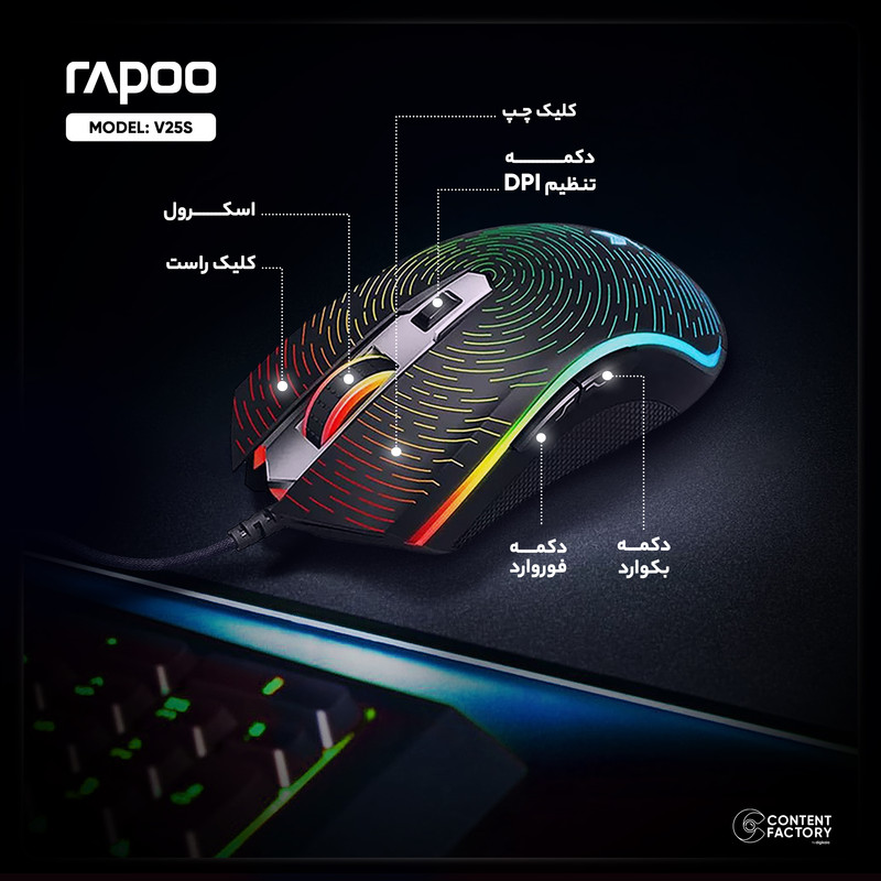 ماوس مدل رپو V25S یکی از ماوس‌های مخصوص بازی با‌دقت 7000DPI بوده که برای اکثر گیمر‌ها مناسب بوده است. این مدل از ماوس‌ها از ظاهر بسیار زیبایی برخوردار هستند. به‌همین دلیل افراد بسیار‌ی را به خود جذب کرده‌اند. ماوس‌ رپو مدل V25S همانطور که از نامش پیدا است توسط شرکت رپو تولید شده و طراحی آن به‌گونه‌ای بوده که افراد بتوانند برای بازی از آن استفاده کنند. در واقع این ماوس از حافظه ‌داخلی بالایی برخوردار بوده و می‌تواند تنظیماتی مانند تنظیمات ماکرو، DPI و حالت نور را در خود ذخیره کند. این ماوس با کابلی به طول 180 سانتی‌متر به کامپیوتر متصل می‌شود. همچنین با حسگر اپتیکال با دقت بیشتز از 3200 قابل استفاده بر روی سطوح چوبی، سنگی و شیشه‌ای است.