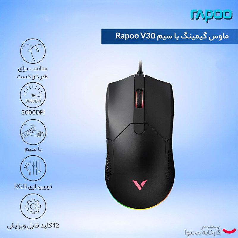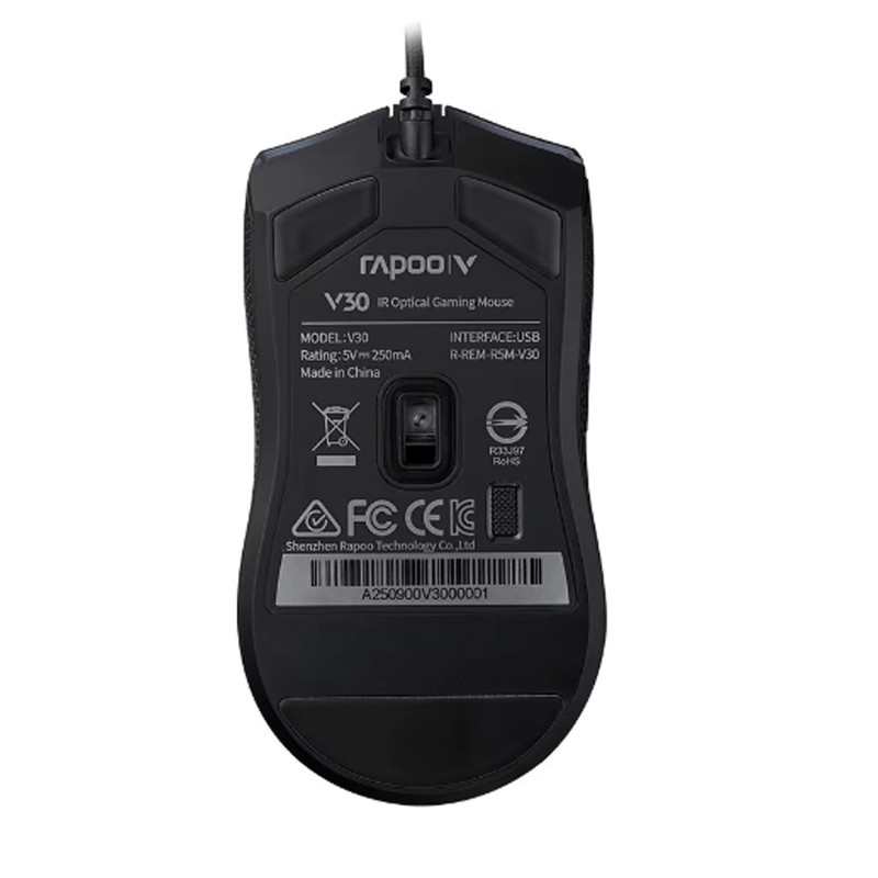 ماوس «V30» محصولی از شرکت «رپو» است که از طریق پورت USB به رایانه متصل میشود. شرکت رپو نوع سنسور اپتیکال را برای ماوس V30 در نظر گرفته است. یکی از مهمترین فاکتورها برای بسیاری از کاربران سرعت انتقال اشارهگر ماوس از قسمتی به قسمت دیگر صفحهنمایش است. هر چه میزان DPI در یک ماوس مقدار زیادتری باشد، این سرعت هم بیشتر خواهد بود. میزان دقت این ماوس در این مورد DPI مقدار 5000می باشد. جنس بدنهی ماوس V30 از پلاستیک با کیفیت است که میتواند در برابر بسیاری از صدمات مقاومت خوبی از خود نشان دهد. اگر قصد تهیهی یک ماوس حرفهای با طراحی ساده را دارید، V30 انتخابی هوشمندانه برای شما خواهد بود.