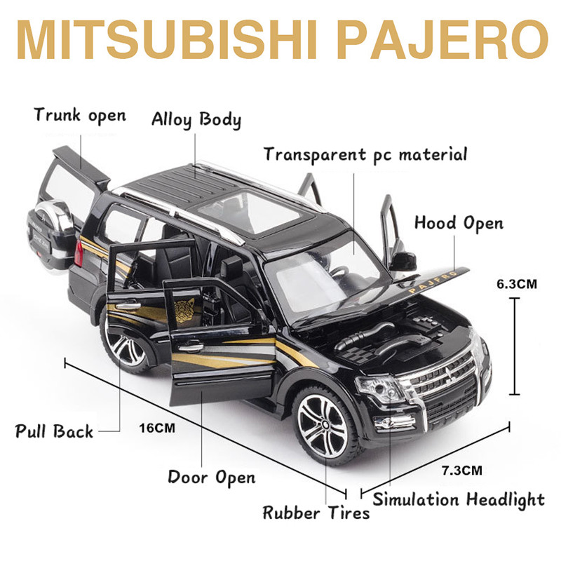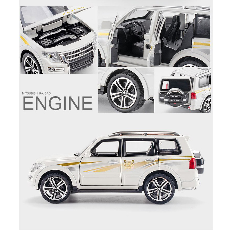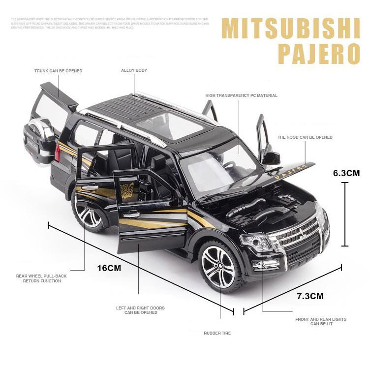 ماکت پیش رو مدل میتسوبیشی پاجرو (MITSUBISHI PAJERO ) میباشد که جزء محبوب ترین مدل ها بین کلکسیون دارها و افراد علاقه مند به ماشین است.شرکت چه ژی در طراحی و ساخت این ماشین نهایت دقت و کیفیت را به کار برده و این ماکت به بهترین شکل ممکن دارای جزئیات و رنگ امیزی میباشد.این ماکت از جنس فلزی میباشد و به روش دایکست ریخته گری شده است.درب های جلو،عقب،کاپوت و صندوق آن باز میشود.چراغ های جلو و عقب روشن میشود.ماشین دارای سیستم عقب کش و موزیکال میباشد.