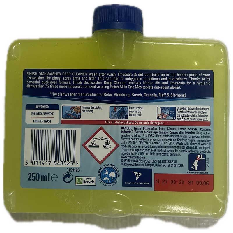 توضیحات و مشخصات مایع جرم گیر ماشین ظرفشویی فینیش 250 میلی لیتری