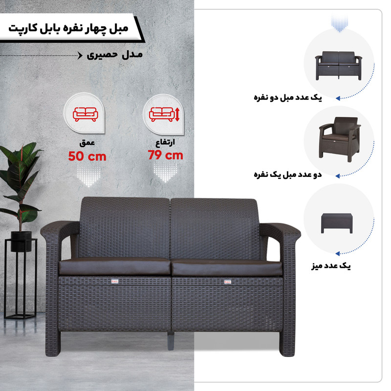 شاید یکی از دغدغههای شما برای استفاده از فضای حیاط و یا تراس، نداشتن یک ست مبلمان راحتی باشد که مناسب برای فضای باز است. امکان استفاده از مبلمان چوبی و یا فلزی در این فضاها وجود ندارد. زیرا در تماس با گردوغبار و رطوبت و باران در کمترین زمان دچار فرسودگی میشوند. بهترین گزینه برای این مواقع، استفاده از مبلمان پلیمری است. مبلمانی که در صورت شستن هم آسیبی متوجه آنها نباشد. ست چهار نفره مبلمان راحتی «بابل کارپت» مدل حصیری که ساخته شده از مواد پلیمری بسیار باکیفیت و مرغوب بوده و برای استفاده در فضاهای باز، تراس و کنار استخر مناسب خواهد بود. این ست مبلمان چهار نفره به راحتی قابل اسمبل شدن است و با استفاده از پیچ و مهرههایی که داخل بستهبندی آن قرار دارد روی هم سوار میشود. حتی برای راحتی بیشتر نیز دستورالعمل نصب داخل جعبه قرار دارد. این مبلمان شامل یک میز و یک ست چهار نفره دارای تشک با روکش چرم مصنوعی است که داخل آن با الیاف مصنوعی فشرده پر شده است.
