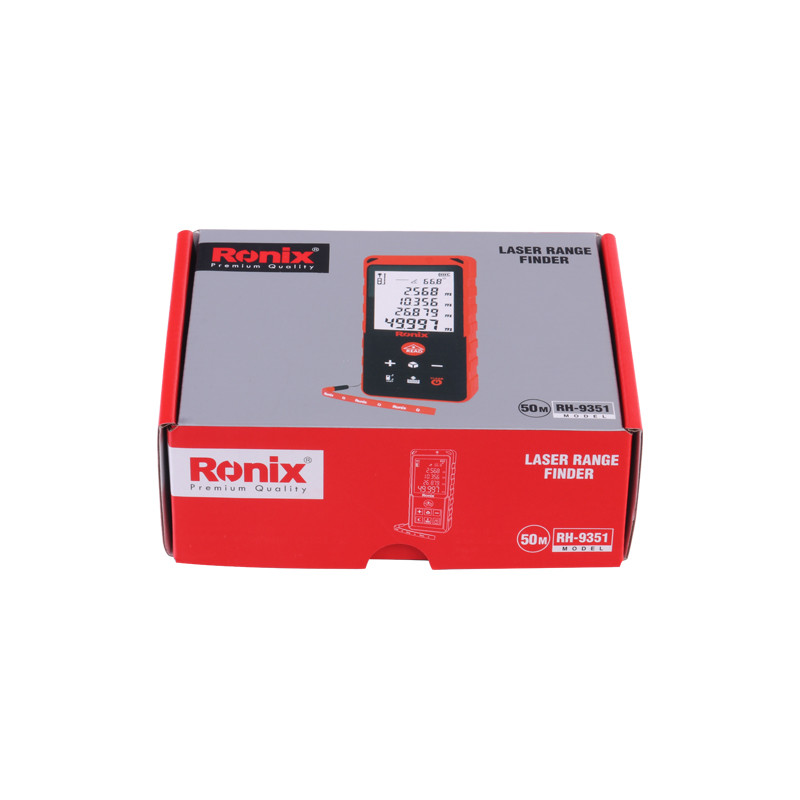 متر لیزری رونیکس مدل RH-9351 یک متر با قابلیت های عملکرد اندازه گیری به تمامی واحد های اندازه گیری بر اساس متر، فوت و اینچ و قابلیت تبدیل تمامی واحد های اندازه گیری به یکدیگر نیز می باشد. این متر مجهز به صفحه کلید روان با عمر و کارکرد مستمر است. این دستگاه دارای قابلیت اندازه گیری مستمر و دلخواه جهت محاسبه جابجایی را دارد همچنین انجام عملیات کاربردی تکمیلی اندازه گیری ماند مشخص کردن حد اقل و حداکثر، قابلیت جمع و تفریق محاسبه ی مساحت، اندازه گیری حجم و محاسبه ارتفاع با کمک فرمول فیثاغورث است. سرعت اندازه گیری و دقت این محصول بسیار بالا بوده که باعث ایجاد سهولت در حین کار می شود.