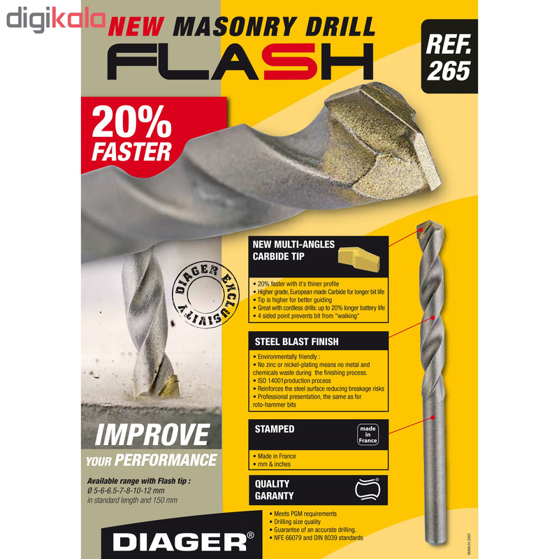 | سایر توضیحات | قد کل 150 میلی متر طول مارپیچ 85 میلیمتر 20% سرعت بیشتر در سوراخکاری 20% مصرف کمتر باتری در دریل های شارژی نوک بلندتر مته جهت راهنمایی بهتر مته هنگام سوراخکاری استفاده از کارباید اروپایی با طول عمر بالا استفاده از فولاد تقویت شده جهت کاهش احتمال شکستن مته ساخت فرانسه |