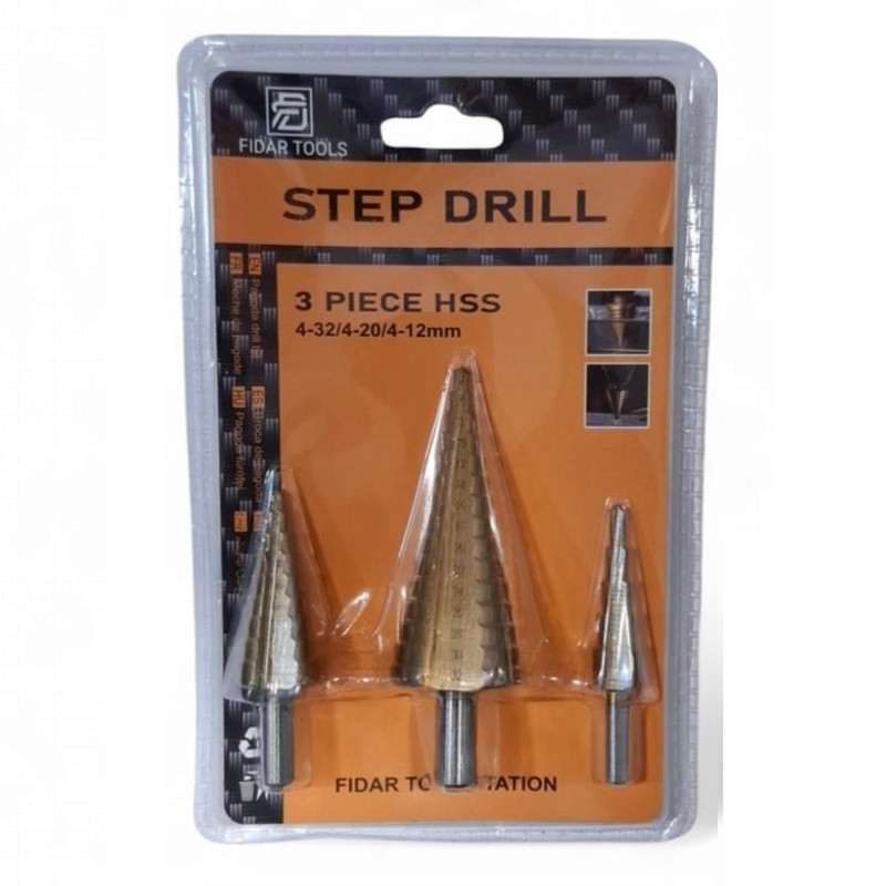 این مجموعه شامل سه عدد مته کاجی در اندازههای 4-12و4-20و4-32 است. مته کاجی و یا مته پله ای مته ای مناسب برای ایجاد سوراخ در ابعاد مختلف 4 تا 32 است.