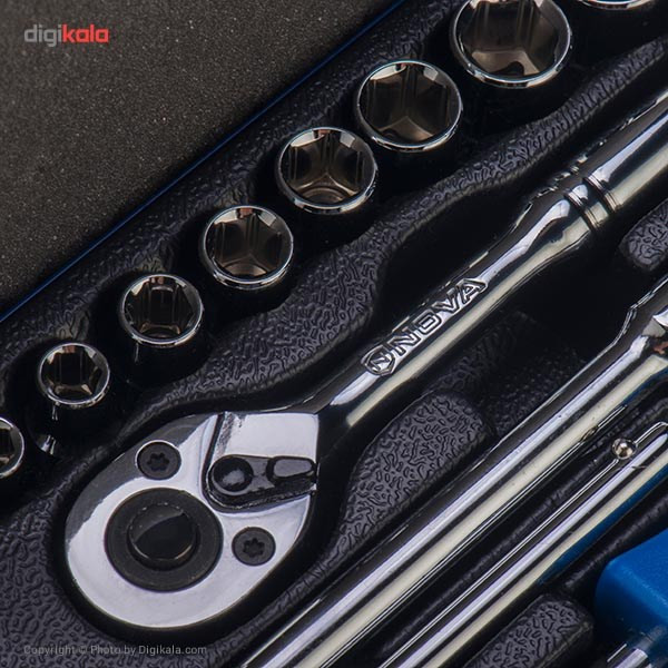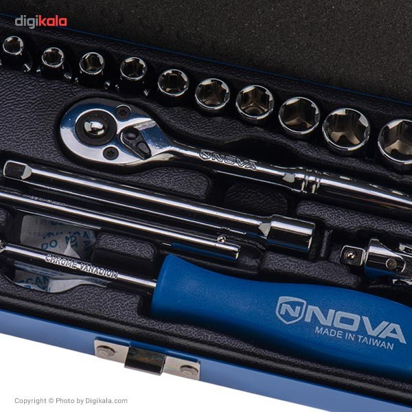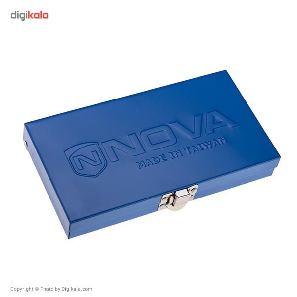 مجموعهی آچار بکس مدل NTS 7003 یک ست 17 عددی است که شرکت «نووا» (Nova) آن را عرضه میکند. این محصول ابعادی کوچکی دارد و در یک بستهبندی بسیار مناسب قرارگرفته است. این مجموعه شامل تعدادی سری بکس، دو مدل دسته بکس و یک اضافه شوندهی طول و یک دستهی پیچگوشتی میشود. جنس بهکاررفته در ساخت تمامی این وسایل مرغوب، محکم و بادوام است. نووا در این محصول و مجموعه در ابعاد 3× 10.5×20 سانتیمتر و از آلیاژ کروم-وانادیوم ساخته میشود. ترکیب دو مادهی کروم و وانادیوم مادهی مقاومی را میسازند که مقاومت بالایی در برابر ضربه، فشار و حرارت از خود نشان میدهد. 12 سری بکس قرارگرفته در این مدل، سایزهای مختلفی دارند؛ سایزهای بکس این مجموعه عبارت است از سایز 4، 4.5، 5، 5.5، 6، 7، 8، 9، 10، 11، 12 و 13. دو گونه دستهی بکس با درایو ¼ اینچ برای این محصول در نظر گرفتهشده است؛ یکی از آنها دسته بکس جقجقهای با طول 13 سانتیمتر و دستهبکس دیگر، یک دستهی T شکل است. یک لقلقه و یک اضافه شونده طول (10 سانتیمتری) و یک دستهی پیچگوشتی هم در جعبهی محصول دیده میشود. دستهی پیچگوشتی این محصول با 15 سانتیمتر طول قابلیت اضافه شدن به دستهی بکس را دارد. انتهای دستهی پلاستیکی این پیچگوشتی قطعهای فلزی با درایو ¼ قرارگرفته است. برای حفظ قابلیت اضافه شدن دستهی پیچگوشتی، بهتر است که از ضربه زدن به انتهای آن خودداری کنید. تمام 17 قطعهی این مجموعهی آچار بکس که شامل 12 سری بکس، یک اضافهشوندهی طول، دو دستهی بکس، یک لقلقه و یک دستهی پیچگوشتی میشوند، در یک جعبهی ارگانیزهی فلزی که یک قفل بسیار محکم دارد، در اختیار شما قرار خواهد گرفت.