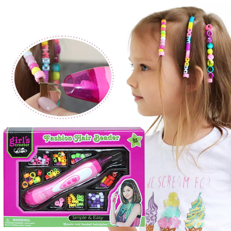 ست بافت مو اسباب بازی شامل یک دستگاه برای تزئین مو و شانه و چندین قطعه که موها را می توان با ان تزئین کرد. این اسباب بازی یک دستگاه برای دختران بالای پنج سال می باشد تا موهای خود را بصورت خاص درست کنند. استفاده از این اسباب بازی بسیار راحت و آسان می باشد و لازم به داشتن سواد و یا تجربه خاص نیست.برای استفاده از این دستگاه بافت مو ابتدای کمی از مو خود را جدا کنید و داخل نوک دستگاه قرار دهید و حلقه های که دوست دارید با ان موهای خود را تزئین کنید برروی میله نوک دستگاه قرار دهید و دستگاه را روشن کنید و آرام به سمت پایین بکشید تا حلقه ها وارد مو بشوند و آرام از موها جدا کنید. با فشار دادن دسته صورتی روی دستگاه، میله بالای دستگاه به سمت بالا می آید و حلقه ها را وارد موها می کند. این اسباب بازی در یک بسته بندی جعبه ای طلقی و جذاب قرار دارد.این اسباب بازی باتری خور نیست و بصورت دستی و مکانیکی کار می کند و موتور برقی در این اسباب بازی استفاده نشده است. جنس اسباب بازی از پلاستیک مرغوب تولید شده که از مواد درجه یک می باشد و حلقه های آن هم از جنس پلاستیکی شیشه ای می باشد که دارای رنگ های بسیار زیبا و شکیل می باشد که می تواند موها شما را به زیبایی تزئین کند.