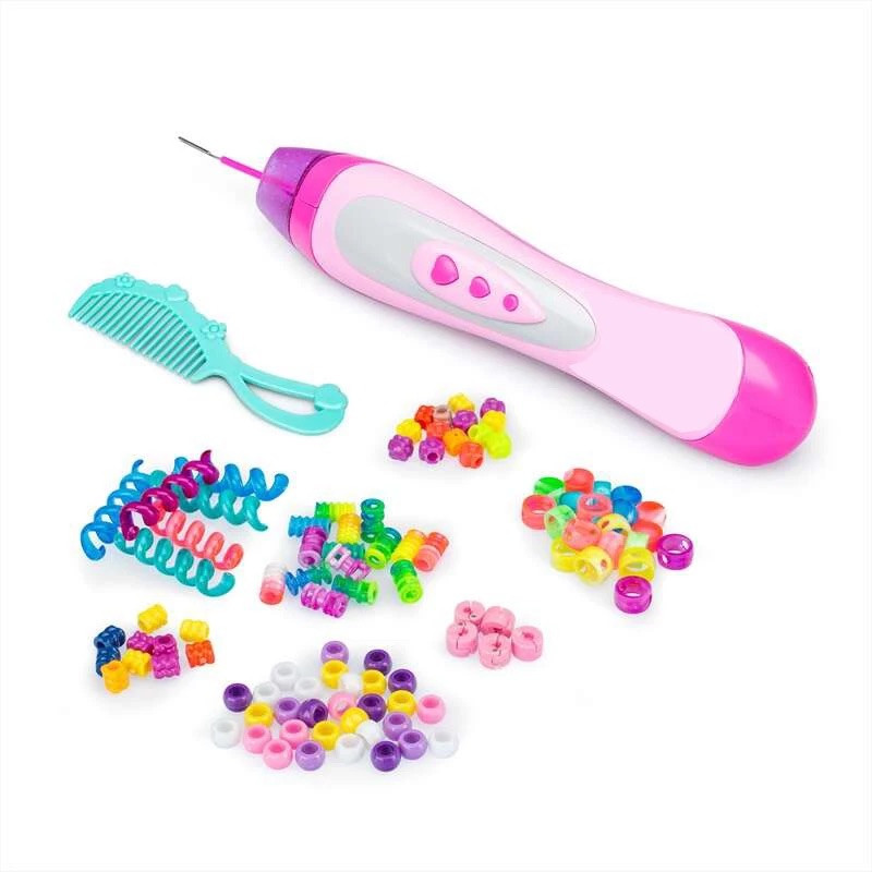 ست بافت مو اسباب بازی شامل یک دستگاه برای تزئین مو و شانه و چندین قطعه که موها را می توان با ان تزئین کرد. این اسباب بازی یک دستگاه برای دختران بالای پنج سال می باشد تا موهای خود را بصورت خاص درست کنند. استفاده از این اسباب بازی بسیار راحت و آسان می باشد و لازم به داشتن سواد و یا تجربه خاص نیست.برای استفاده از این دستگاه بافت مو ابتدای کمی از مو خود را جدا کنید و داخل نوک دستگاه قرار دهید و حلقه های که دوست دارید با ان موهای خود را تزئین کنید برروی میله نوک دستگاه قرار دهید و دستگاه را روشن کنید و آرام به سمت پایین بکشید تا حلقه ها وارد مو بشوند و آرام از موها جدا کنید. با فشار دادن دسته صورتی روی دستگاه، میله بالای دستگاه به سمت بالا می آید و حلقه ها را وارد موها می کند. این اسباب بازی در یک بسته بندی جعبه ای طلقی و جذاب قرار دارد.این اسباب بازی باتری خور نیست و بصورت دستی و مکانیکی کار می کند و موتور برقی در این اسباب بازی استفاده نشده است. جنس اسباب بازی از پلاستیک مرغوب تولید شده که از مواد درجه یک می باشد و حلقه های آن هم از جنس پلاستیکی شیشه ای می باشد که دارای رنگ های بسیار زیبا و شکیل می باشد که می تواند موها شما را به زیبایی تزئین کند.