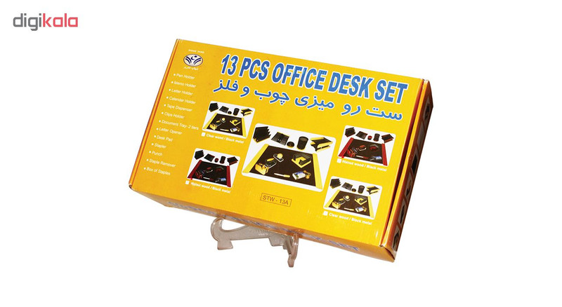 | اقلام موجود در ست | کازیه , جای کاغذ یادداشت , پایه چسب , جامدادی رومیزی , جای نامه , جای گیره , پانچ , منگنه , منگنه کش |
