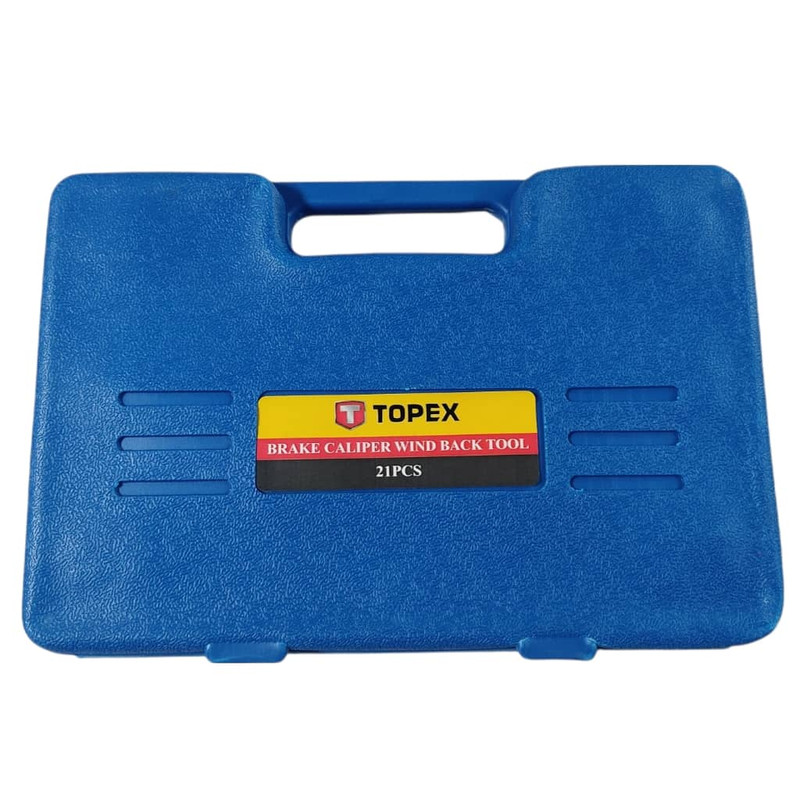 کیت کالیپر ترمز 21 پارچه تاپکس جز ابزار آلات تخصصی برای باز و بست کالیپر ترمز انواع خودروهای داخلی و خارجی میباشد. این مجموعه دارای 17 عدد سری مختلف، دو عدد پیستون و دو عدد قطعه مخصوص نگه دارنده لنت میباشد.