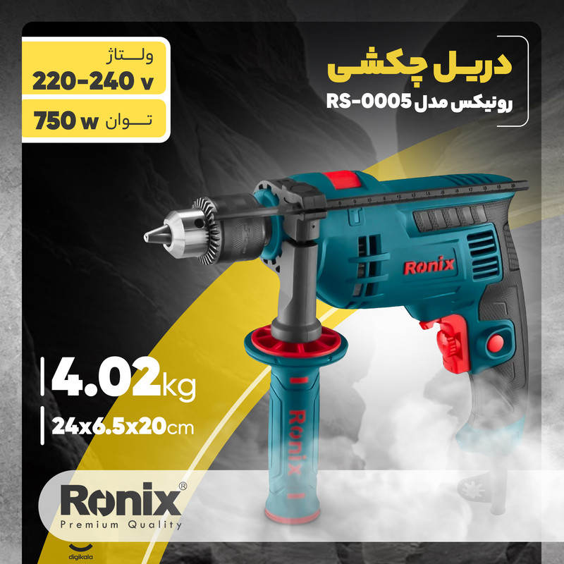 ست کیف ابزار رونیکس مدل RS-0005، مجموعه کاملی از یک دریل چکشی و انواع مته و سر پیچگوشتی های مختلف است. این مجموعه کامل، برای استفاده در مصارف خانگی و صنعتی به کار شما میآیند. این ست کیف ابزار، در یک کیف مقاوم به ضربه BMC به بازار ابزار ایران و جهان عرضه میشود. دریل موجود در ست کیف ابزار 54 تایی رونیکس مدل RH-0005، مجهز به یک موتور 750 واتی بسیار قدرتمند برای بهترین کارایی در سوراخکاری و دریلکاری چکشی است و میتواند با سرعتی بالغ بر 2700 دور در دقیقه کار کند. سهنظام این دریل، آچاری و تمامفلزی بوده و با ظرفیت 13-1.5 میلیمتر کار میکند. مجموعه ابزارآلات و قطعات موجود در این کیت، در صنایع چوبی، فلزی و ساختمانی مورد استفاده قرار میگیرند.