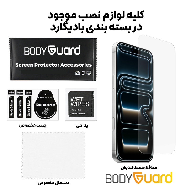 محافظ صفحهنمایش شیشهای مدل Clear از برند بادیگارد برای گوشی iPhone 17 Pro Max انتخابی ایدهآل برای کاربرانی است که به دنبال ترکیب حداکثر شفافیت با استحکام بالا هستند. این گلس با تکنولوژی شیشهی حرارتدیده و سختی 9H ساخته شده و در برابر خط و خش، ضربههای روزمره و حتی اجسام نوکتیز مقاومت عالی دارد، در حالی که به دلیل ضخامت بسیار کم خود، هیچ تأثیری بر وضوح نمایشگر و حساسیت لمس ندارد. لبههای برشخوردهی دقیق و طراحی تمامصفحه آن باعث میشود بهطور کامل با ابعاد iPhone 17 Pro Max هماهنگ شده و تجربهای بینقص از کار با گوشی فراهم شود. در بستهبندی رسمی بادیگارد تمام لوازم نصب شامل پد الکلی، دستمال مخصوص، برچسب راهنما و ابزار جذب گرد و غبار وجود دارد تا کاربر بتواند بهسادگی و بدون ایجاد حباب، گلس را روی گوشی خود نصب کند.
