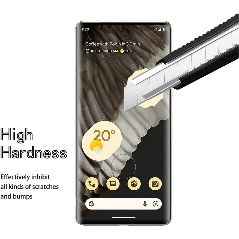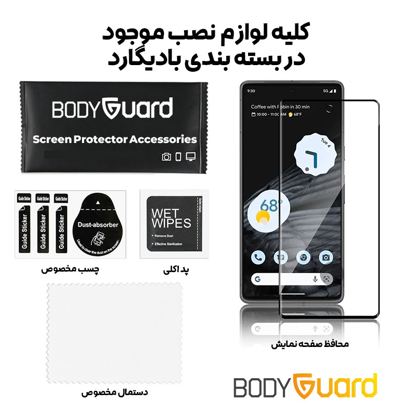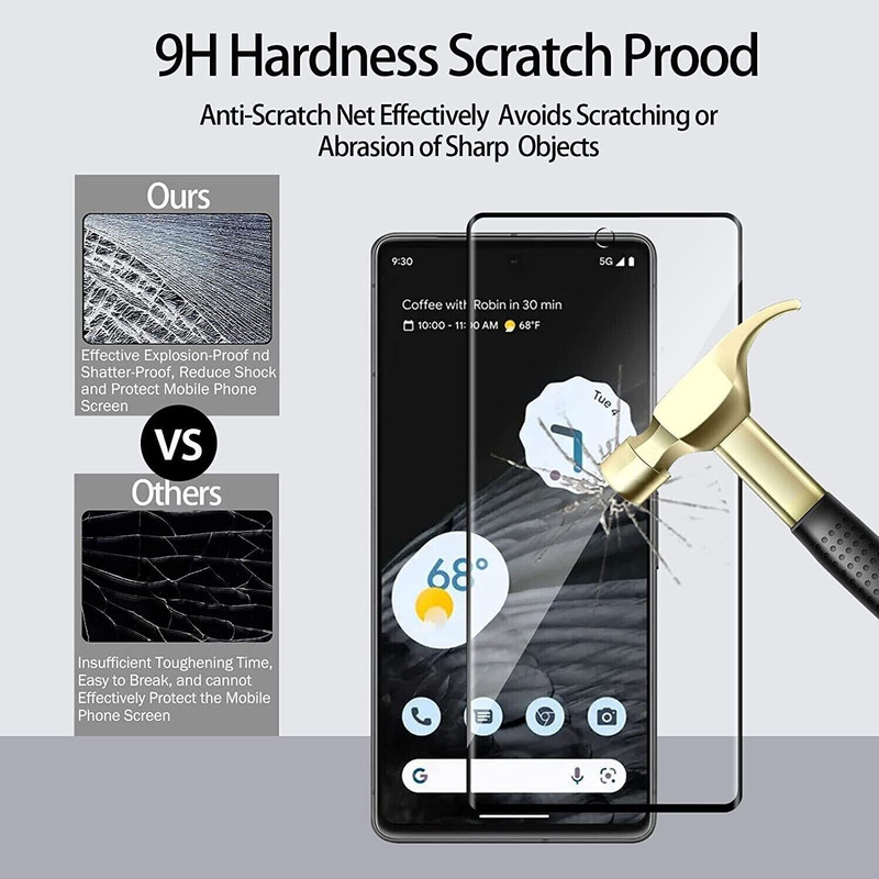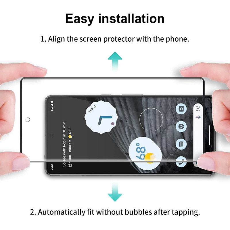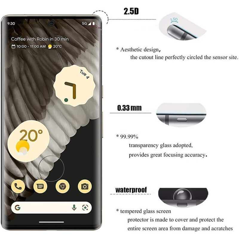 گلس Google Pixel 7 Pro از نوع دورچسب بوده که تمام صفحه نمایش را پوشش می دهد. همچنین قسمت اثر انگشت برای بهتر شدن عملکرد سنسور اثر انگشت دارای چسب می باشد.
