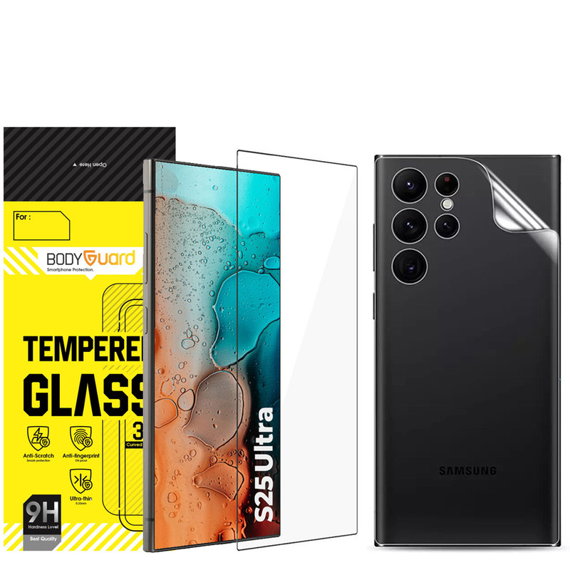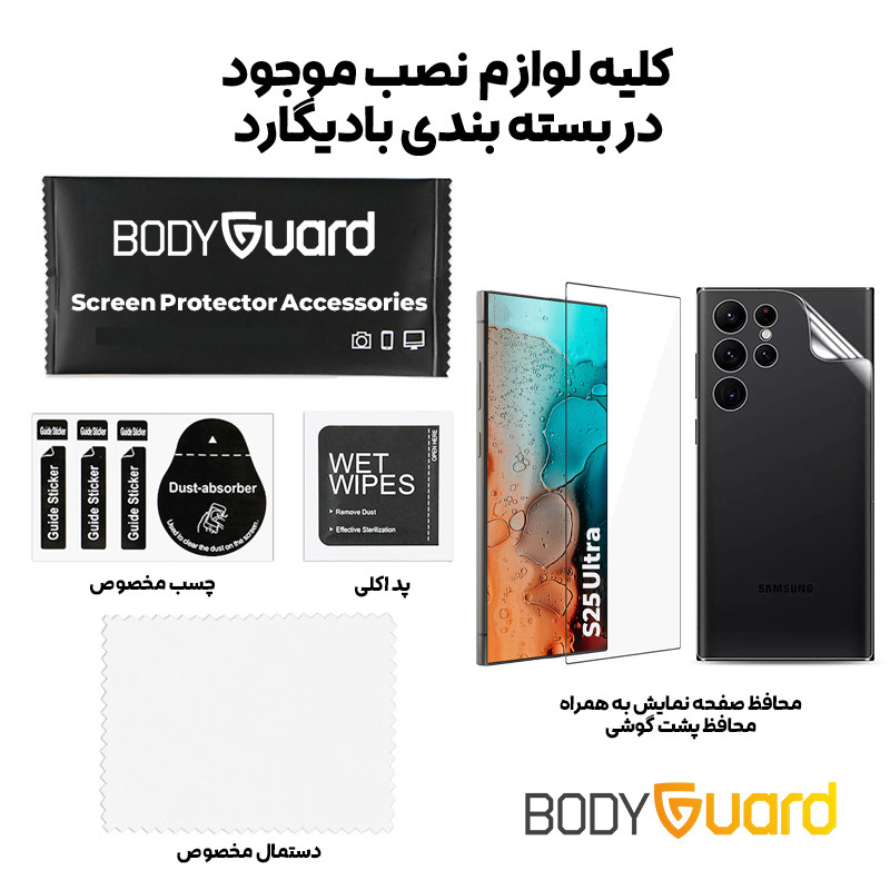 | اقلام همراه | گلس شیشه ای - محافظ پشت هیدروژلی - پد الکلی - دستمال پارچه ای - چسب پرزگیر - کاردک |