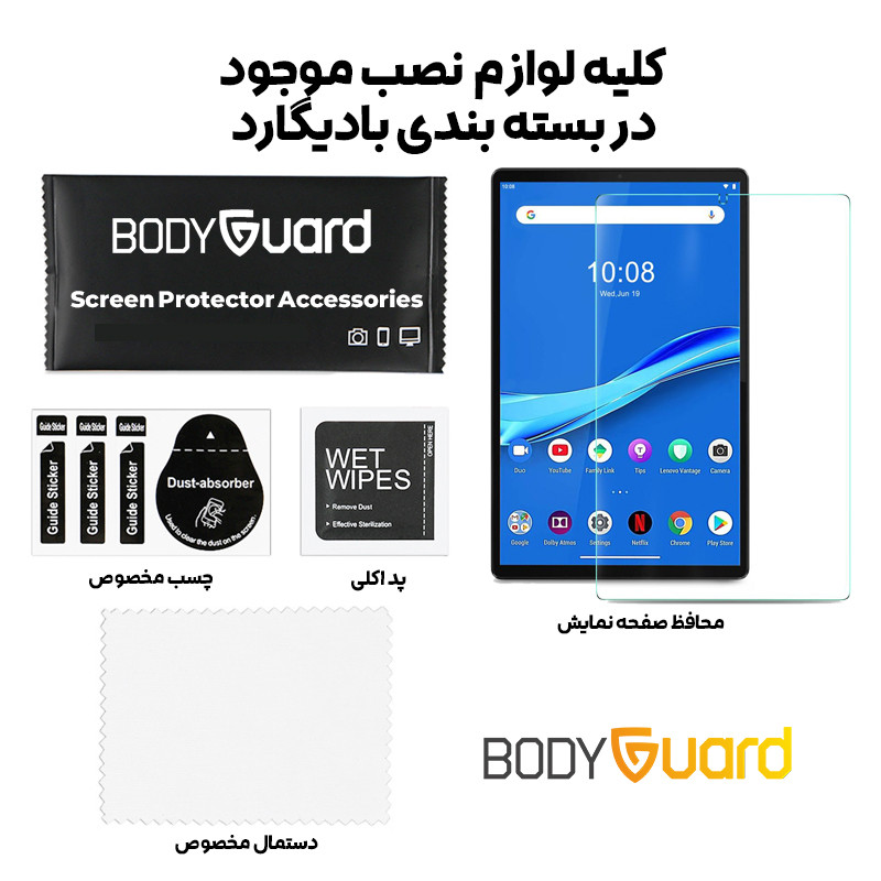 با توجه به اندازه بزرگ صفحه نمایش تبلت ها شرکت بادیگارد اقدام به تولید محافظ صفحه کرده که علاوه بر پوشش تمام صفحه نمایش مقاومت زیادی در برابر آسیب ها داشته باشد و کیفیت صفحه نمایش را کم نکند. این محصول گلس شیشه ای بادیگارد مناسب برای تبلت لنوو K10 می باشد.