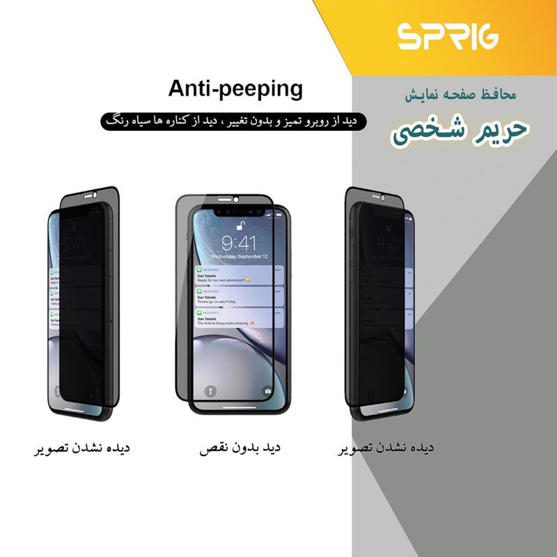 محافظ صفحه نمایش حریم شخصی اسپریگ، با طراحی منحصر بفرد خود علاوه بر زیبایی و حفاظت، امنیت صفحه نمایش تلفن همراه شما را نیز به همراه میاورد. محافظت کامل از اسکرین گوشی شما با داشتن ویژگی هایی مانند مقاومت در برابر ضربه، ضد خراشیدگی بودن، سختی زیاد و شکنندگی بسیار کم میسر میشود. این گلس با داشتن فناوری Privacy قابلیت ویژه محدود کردن زاویه دید گوشی را دارا میباشد به گونه ای که فقط شما با زاویه مستقیم می توانید از روبرو صفحه نمایشگر گوشی خود را واضح و شفاف ببینید در غیر این صورت افراد دیگر که به صورت زاویه دار به صفحه گوشی نگاه میکنند چیزی جز صفحه تاریک و سیاه نمی بینند بنابراین اگر از گوشی خود برای انجام کارهای اداری و بانکی استفاده میکنید یا دوست ندارید افراد مختلف در مکانهای عمومی و یا حتی در خانه و محلکارتان اطلاعات شخصی شما را ببینند، با استفاده از این گلس می توانید حریم شخصی خود را حفظ کنید. میزان سختی این گلس برابر 9H بوده و به همین دلیل در برابر برخورد با اجسام تیز (چاقو، تیغ، نوک کلید و …) مقاوم بوده و دچار خط و خش نمی گردد.