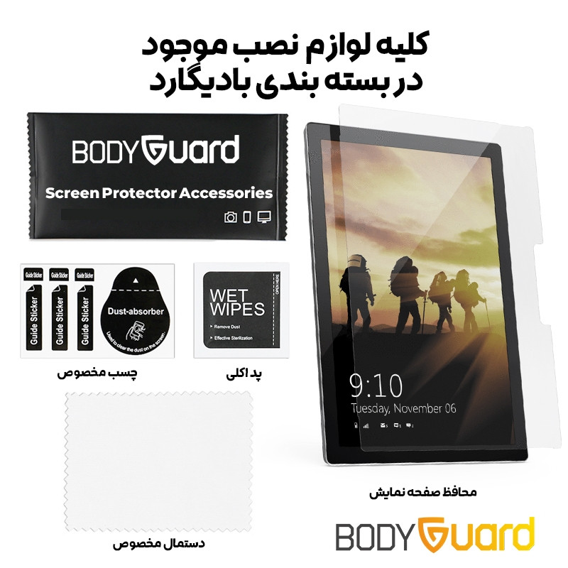 | سایر مشخصات | گلس شیشه ای - نصب بدون حباب - مناسب برای Surface Pro 4 / 5 / 6 / 7 / 7 Plus - تمام لوازم مورد نیاز نصب داخل بسته بندی |
