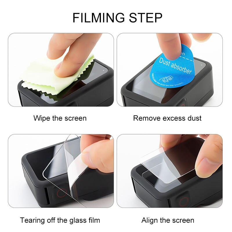 قبل از نصب گلس روی دوربین گوپرو با پدهای تمیز کننده داخل بسته سطح موردنظر را به خوبی تمیز کنید و سپس اقدام به نصب گلس کنید.