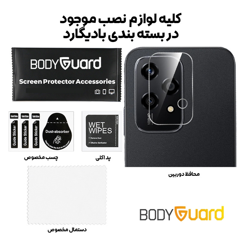 | اقلام همراه | گلس دوربین - پد الکلی - دستمال پارچه ای - چسب پرزگیر |
