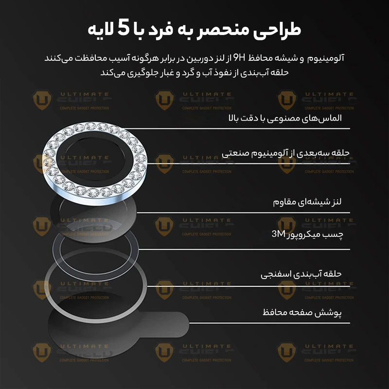 محافظ لنز رینگی نگین دار دوربین آلتیمیت شیلد با در نظر گرفتن دو جنبه ی زیبایی و حفاظت، یک محافظ تمام عیار برای لنز دوربین میباشد. این محافظ برای دوربین اصلی طراحی شده است تا آن را از خط و خش، شکستگی و آسیب های احتمالی دیگر حفظ کند و مانع از نشستن هر گونه لک و چربی روی لنز و در نتیجه افت کیفیت دوربین شما می شود. با وجود نصب آسانی که دارد میتوانید به راحتی آن را روی دوربین گوشی خود نصب کنید و نگران ماندن رد این گلس روی دوربین به هنگام جدا کردن آن نباشید چرا که هیچ ردی روی شیشه دوربین برجای نمی گذارد و پس از جدا کردن آن، دوربین مثل روز اولش خواهد بود. در نهایت اینکه این محافظ لنز تاثیری روی لنز دوربین و کیفیت تصاویر یا فیلم های ثبت شده ندارد و می توانید با خیال راحت از آن استفاده کنید.
