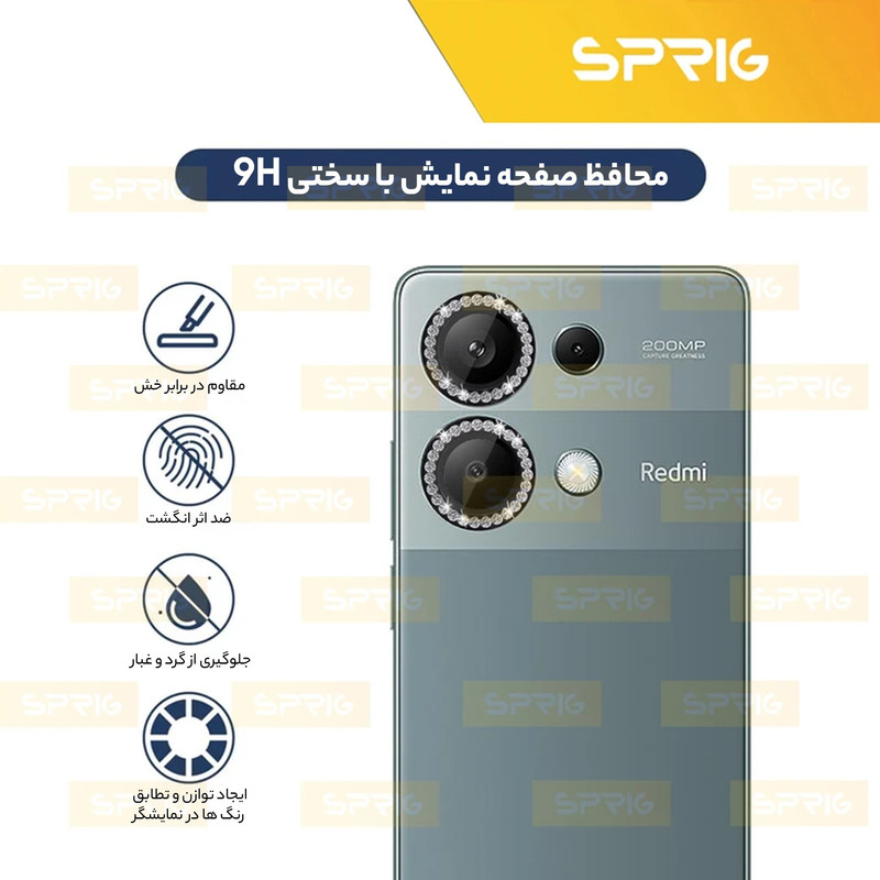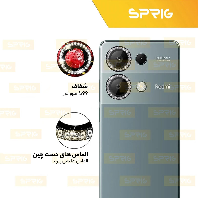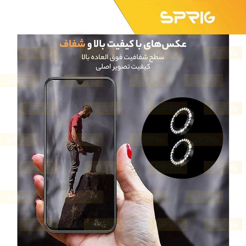 محافظ لنز دوربین رینگی نگین دار اسپریگ با در نظر گرفتن دو جنبه ی زیبایی و حفاظت، یک محافظ تمام عیار برای لنز دوربین میباشد. این محافظ برای دوربین اصلی طراحی شده است تا آن را از خط و خش، شکستگی و آسیب های احتمالی دیگر حفظ کند و مانع از نشستن هر گونه لک و چربی روی دوربین شود. با وجود نصب آسانی که دارد میتوانید به راحتی آن را روی دوربین گوشی خود نصب کنید و نگران ماندن رد این گلس روی دوربین به هنگام جدا کردن آن نباشید چرا که هیچ ردی روی شیشه دوربین برجای نمی گذارد و پس از جدا کردن آن، دوربین مثل روز اولش خواهد بود. در نهایت اینکه این محافظ لنز تاثیری روی لنز دوربین و کیفیت تصاویر یا فیلم های ثبت شده ندارد و می توانید با خیال راحت از آن استفاده کنید.