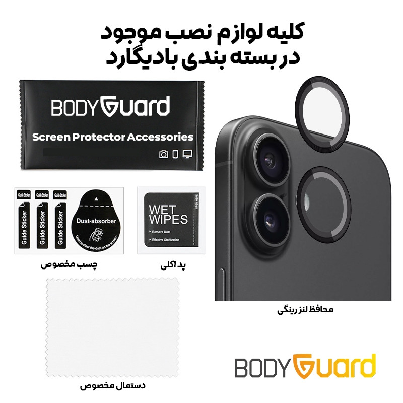 محافظ لنز بادیگارد مدل رینگی برای گوشی iPhone 17 با طراحی دقیق و کیفیتی مثالزدنی، یکی از ضروریترین لوازم جانبی برای حفظ سلامت و کارایی دوربین این پرچمدار اپل محسوب میشود. این محافظ با استفاده از شیشه حرارتدیده با سختی 9H ساخته شده و در برابر خطوخش، ضربه و آسیبهای روزمره مقاومت بالایی دارد. وجود حلقه مشکی اطراف لنزها باعث جلوگیری از نشت نور و بازتابهای ناخواسته میشود تا تصاویر ثبتشده شفافتر و با جزئیات دقیقتری به نمایش درآیند. طراحی باریک و دقیق این محصول، کاملاً با برآمدگی لنزها هماهنگ بوده و بدون ایجاد فاصله اضافی بهصورت یکپارچه روی دوربین قرار میگیرد. همچنین پوشش ضداثرانگشت و لایه سیلیکونی آن مانع از لک و کثیف شدن سطح محافظ میشود. این مدل بادیگارد علاوهبر مقاومت بالا، با انواع قابهای محافظ نیز سازگاری کامل دارد و از نظر نصب نیز بسیار آسان است؛ چرا که تمامی لوازم جانبی موردنیاز مانند دستمال مخصوص، پد الکلی و چسبهای راهنما در بستهبندی قرار داده شدهاند. اگر بهدنبال ترکیبی از زیبایی، دوام و کارایی برای حفاظت از دوربین iPhone 17 هستید، محافظ لنز رینگی بادیگارد بهترین انتخاب خواهد بود.