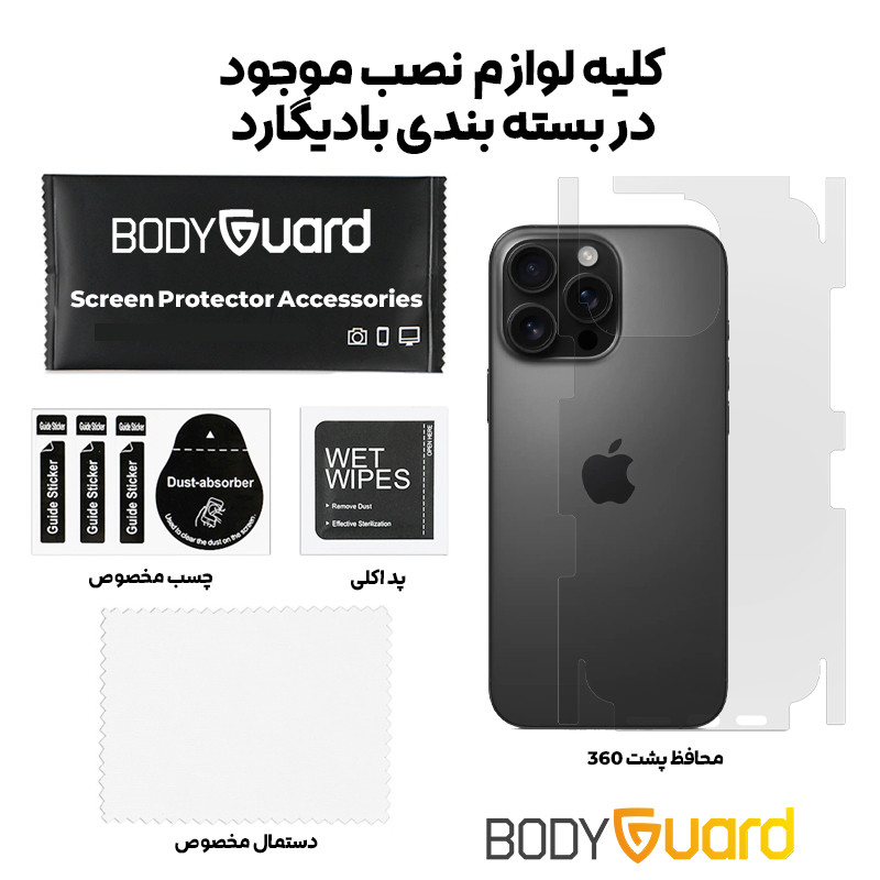 | اقلام همراه | محافظ پشت 360 درجه - دستمال مرطوب - دستمال پارچه ای - چسب پرز و گرد و غبار - کاردک |