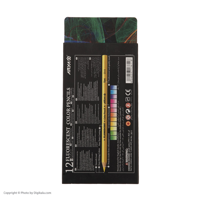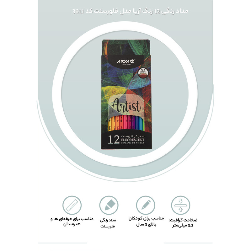 | سایر توضیحات | - مداد رنگی فلورسنت - ضخامت گرافیت: 3.3 میلیمتر - سری حرفهای آریا - مناسب برای حرفهای ها و هنرمندان - مغز مداد دارای رنگدانههای خالص و مرغوبتر - دارای قابلیت ترکیب پذیری بیشتر - مناسب برای کودکان بالای 3 سال |
