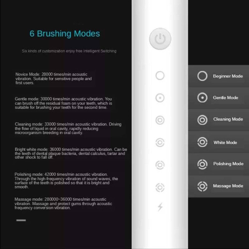 بر روی بدنه دستگاه یک دکمه وجود دارد که این امکان را می دهد تا 5 حالت مختلف سفید کننده، تمیز کننده، حالت حساس، براق کننده و ماساژ دهنده برای شما فعال شود. تمام این گزینه ها نیازها و خواسته های شما را در حین مسواک برآورده می کند. مسواک برقی sonic مدل X-3 می تواند دهان شما را به روش هایی تمیز کند که شما نمی توانید با یک مسواک دستی آن را انجام دهید. همچنین به شما کمک می کند برخی عادات بد مسواک زدن خود را تصحیح کنید. مانند محکم و طولانی مدت مسواک کشیدن، تند و عجله ای مسواک کردن و جاگذاشتن برخی نقاط از دندان ها و لثه.