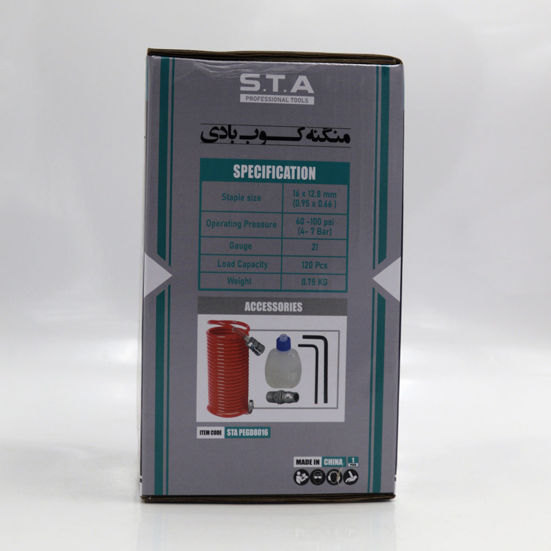 | سایر توضیحات | - منگه کوب بادی اس تی ای - گیج : 21 - ظرفیت خشاب : 120 عدد - سوزن : سری 80 - طول ساقه 6 تا 16 میلیمتر - دارای اگزوز فـوقانی جهت خروج هوای اضافی - مجهز به روکش دسته تزریقی از جـنس پلاستیک ضد تعریق و ضـد لغزش برای راحتی کاربر - دارای سیستم ایمنی پیشرفته جـــهت حفظ ایمنی کاربر - دارای قابلیت باز کردن آسان خشاب با یک قفل انگشتی - طـراحی حرفه ای با وزن سبک و قدرت بالا - دارای سینه سخت کاری شده جـهت طول عمر بالا - بدنه دایکاست آلـومینیوم - قابلیت استفاده در صنایع نجاری٬ مبلمان٬ دکوراسیون داخلی٬ کابینت سازی |