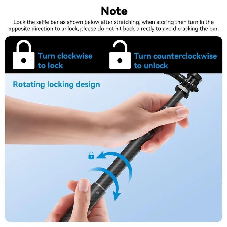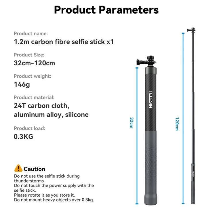 | ویژگی های فنی | 1. طراحی ظاهری جدید، ثبات خوب. 2. مواد فیبر کربن، سبک تر از بسیاری از میله های سلفی. 3. تلسکوپی 5 مرحله ای، قاب انعطاف پذیر. 4. مقاومت در برابر خوردگی خوب، مناسب برای استفاده در فضای باز. 5. پایه سه پایه خارجی موجود است. جنس:فیبرکربن |