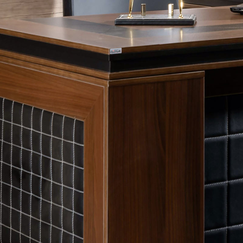 میز مدیریت هیراد مدل M906 با جلوه ای از اقتدار، زیبایی اتاق مدیریت شما را دوچندان میکند.ترکیب چرم و چوب در این مدل میز باعث می شود جذابیت بصری این میز به میزان بسیار زیادی افزایش پیدا کندسه کشو و یک کمد به همراه جای زونکن، فضای لازم برای تجهیزات شما را کاملا داراست با انتخاب رنگ مناسب، میز مدیریت مدل M906 خود را سفارش دهید.جنس این محصول ملامینه می باشد ابعاد محصول به این شرح می باشد طول 180 عرض 165 ارتفاع 76