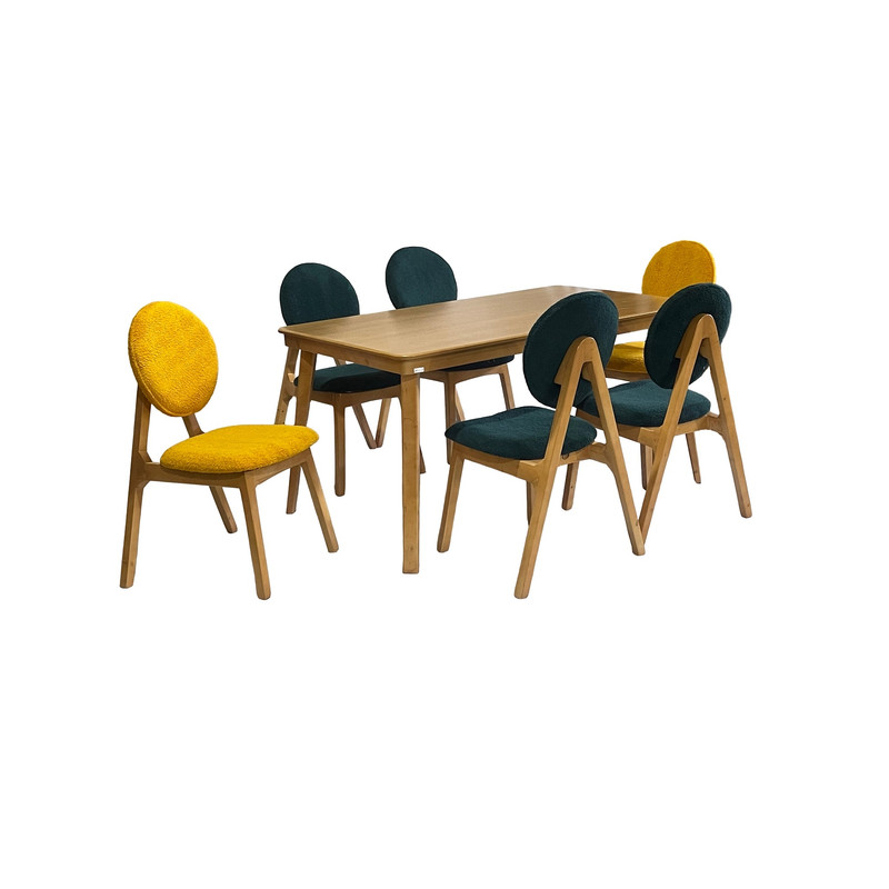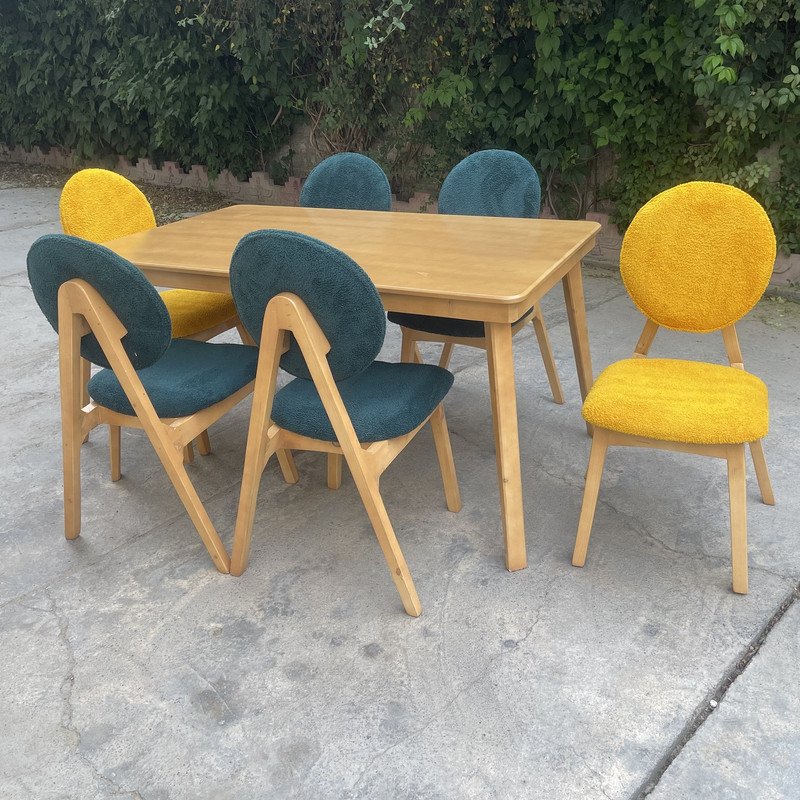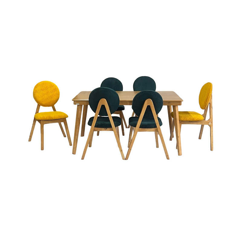 میز و صندلی های غذاخوری یکی از اساسی ترین نیازهای هر خانه می باشد که باید در خرید آن دقت و توجه کافی داشت که در عین اینکه جنس و کیفیت مناسبی دارد، همچنین طراحی جذابی نیز داشته باشد، میز و صندلی نهارخوری ارائه شده توسط گالری چوب آشنایی، با طراحی جدید و دارای زیبایی خاص یکی از جذابترین و شیکترین ستهای نهارخوری موجود در بازار است که برای فضای خانه بسیار مناسب می باشد و می توان زیبایی خاصی را با آن به خانه بخشید. این میز و صندلی مناسب 6 نفر بوده و رنگ بخشهای چوبی آن ثابت و خودرنگ بوده و رنگ پارچه بر اساس تنوع قابل انتخاب است.