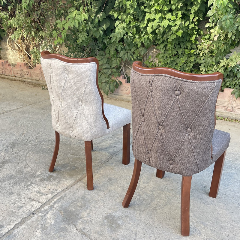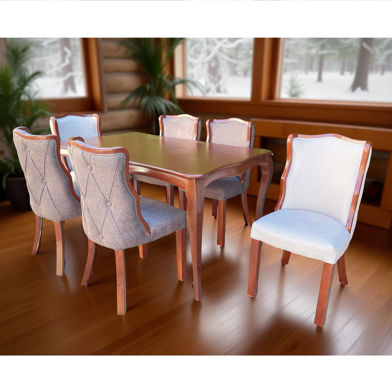 | سایر توضیحات | رنگ بخش چوبی قهوه ای (همانند عکس) و ثابت بوده ، تنوع رنگ انتخابی شما مربوط به رنگ پارچه صندلی ها می باشد. | درجه بندی کیفیت : رنگ آمیزی و نجاری عالی و مقرون به صرفه .| نماهایی که در دید نیستند، رنگ اصلی چوب است(همانند ته پایه های میز که از زیر به میز مونتاژ میشود) | ابعاد در حد ۳ الی۴ سانتیمتر ممکن است خطا داشته باشد.| تفاوت جزئی رنگ چوب بدلیل ساخت دستی|. به مشخصات دقیق محصول دقت کنید. | بدلیل عکاسی تفاوت جزئی در رنگها.| تنوع چند رنگ همانند تصویر اصلی خواهد بود(دو صندلی بژ و چهار تا صندلی طوسی) |