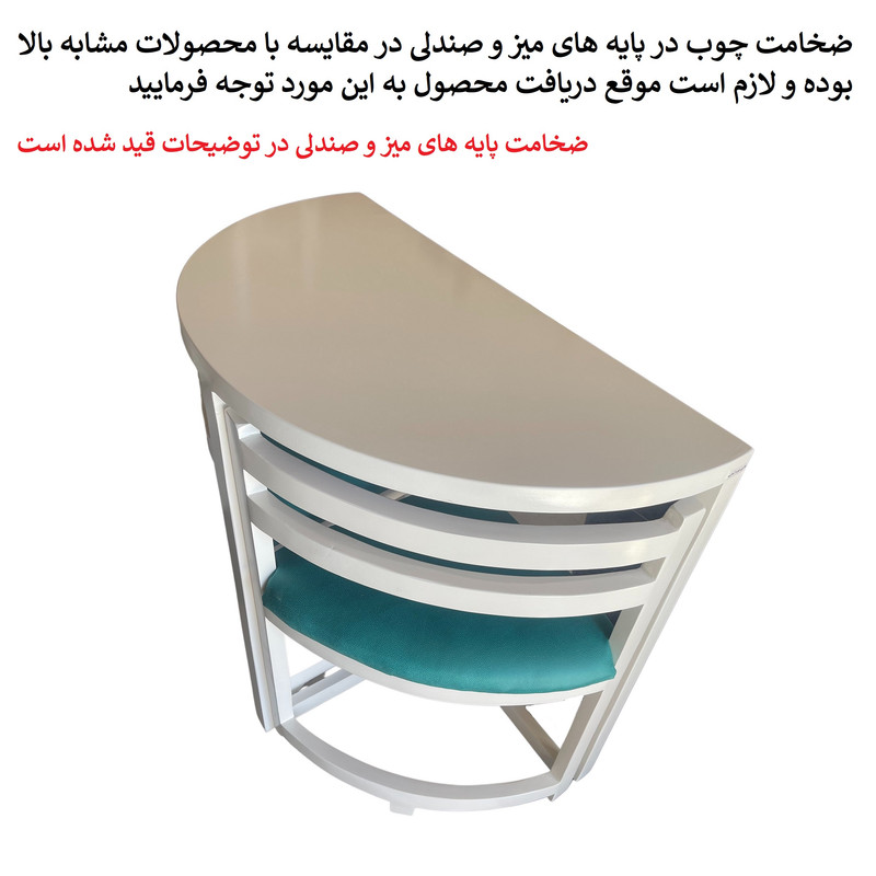 میز و صندلی غذاخوری کمجا یک محصول بسیار مفید و کارآمد و در عین حال با کمترین فضای اشغالی می باشد. این میز و صندلی های گالری آشنایی یکی از با کیفیت ترین و زیباترین محصولات است که با طراحی زیبایی که دارند، بسیار جذاب می باشند. این میز و صندلی ضخامت چوب استفاده شده در آن حدود 4-5 سانتی متر میباشد. این محصول تحمل وزن بسیار بالایی داشته و جزء کارهای بسیار پرفروش می باشد و طرفداران زیادی دارد. توجه کنید که این محصول دارای ضخامت چوب بالایی بوده و توسط فروشنده اصلی گالری چوب آشنایی با این کیفیت ارائه می گردد.